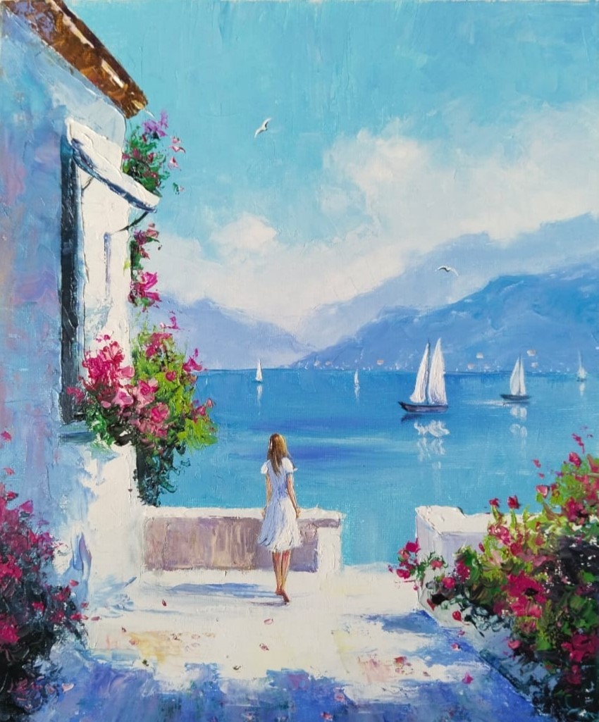 Картина 30х25 см написана мастихином в один присест маслом на холсте (на подрамнике) по впечатлениям от морских путешествий. Наполнена тёплом, солнцем и прекрасным настроением. Будет добавлять в интерьер атмосферу лета и моря. Картина оформлена в красивую раму (багет), что придаёт завершённость произведению. Так же, работа успела принять в двух коллективных городских выставках галереи "Современник".