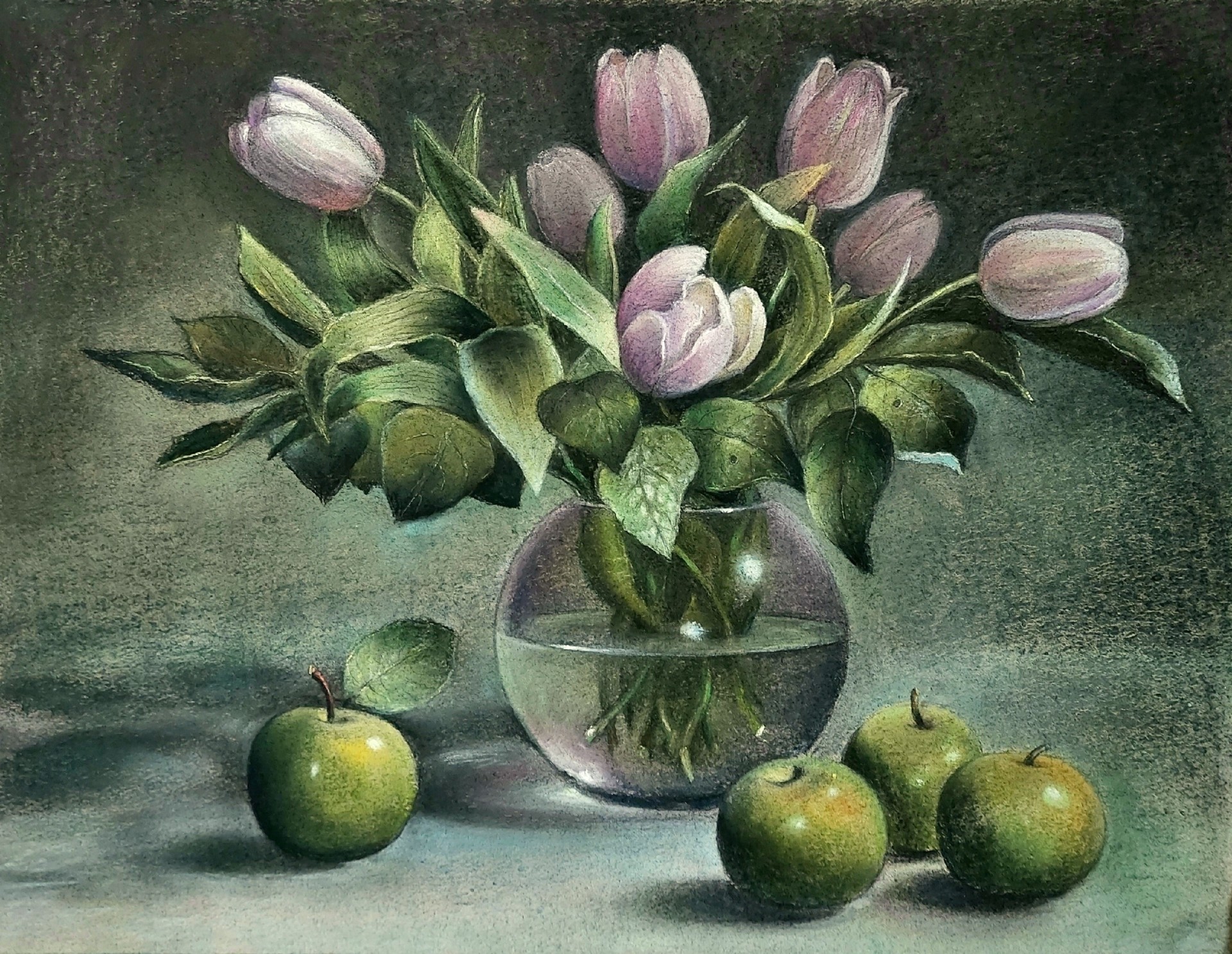Картины Елены Уколовой отличает выверенность каждого штриха, и живописного шага. Её мир наполнен лирикой, и отражается в её картинах. "Розовые тюльпаны", одна из тех сложных по исполнению работ, которая сочетает в себе цветовые переходы и красочные пастельные штрихи, и показывает нам лёгкось момента через образ цветов, и предельную хрупкость через стекло и преломление световых потоков. Картина размером 42х58 см, исполнена профессиональными материалами, пастелью на бумаге и закреплена фиксативом, для сохранности на долгие века. Оформлена в паспарту и раму для цельности взгляда и завершённости произведения. Украсит любой интерьер и привнесёт в него поэтичность момента.