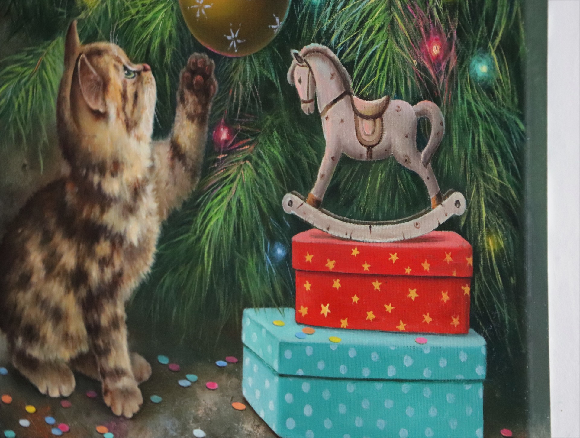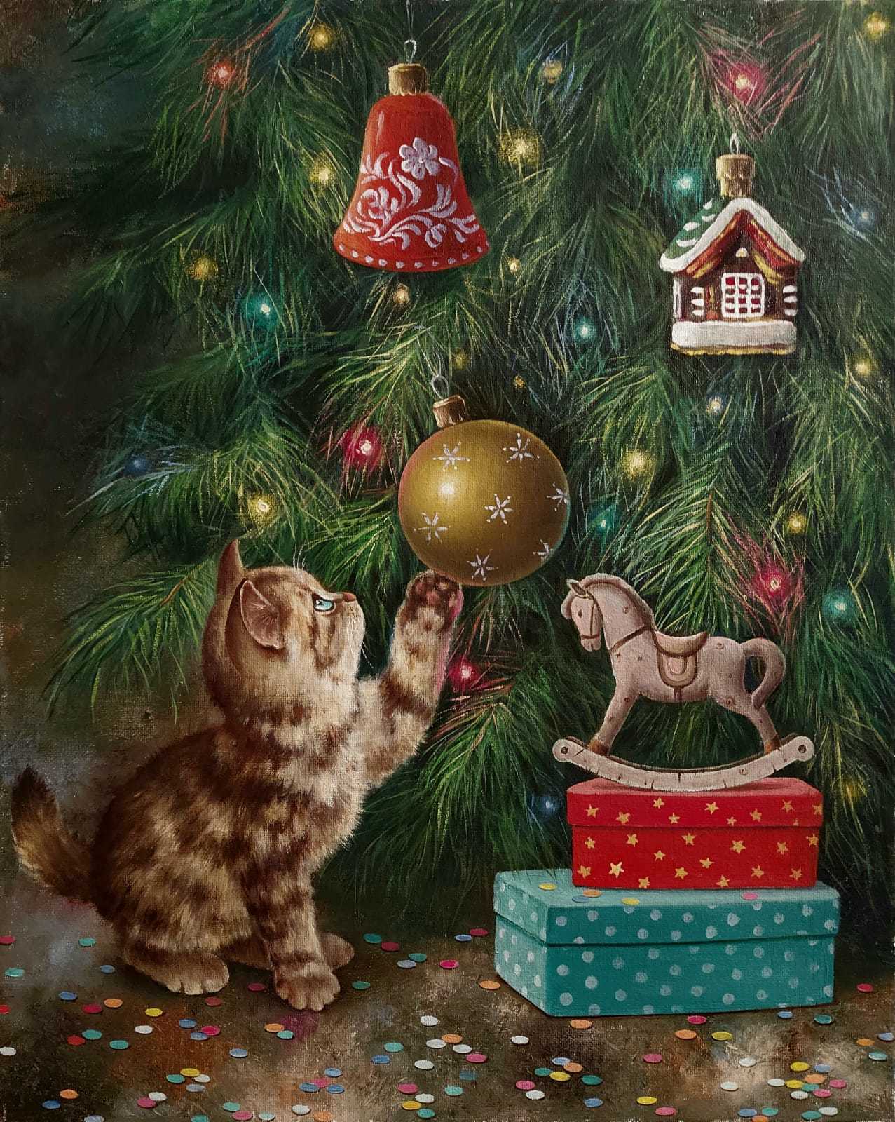 Гюльнара Николаевна Хабибулина. Член СХ России и АИАП ЮНЕСКО. Приглашённый художник международных резиденций. Серия "Новогодняя сказка" состоит всего из 4-х картин и глядя на них, погрузит вас в новогоднюю сказочную атмосферу. Воздух наполняется легким предвкушением волшебства. В доме витает тихая сладость ожидания: за стеклом мерцают снежинки, за окном слышится скрип снега от торопливых шагов прохожих, а внутри теплющаяся лампа создающая отблесками замысловатую ткань узоров и света. Ёлка занимает почётное место, стоит как главная героиня новогодней сказки, её ветви слегка дрожат от прикосновений, и игры ребятни и маленьких котят. А милые игрушки отдают свечением и бликами, каждая со своим характером, рассказывая нам свои уникальные истории из прошлых лет. Гирлянды распускаются по ветвям плавными извивами света, создавая лёгкое мерцание вокруг. Их нити сплетаются вокруг ветвей, как тонкие ручейки, и каждая лампочка добавляет в атмосферу чуть-чуть свечения и нежных воспоминаний: запах мандаринов, лёгкое послевкусие хвои, шум приглушённой праздничной музыки, которая становится частью ритма ожидания. Серпантин лежит везде, рассыпаясь как маленькие красочные искорки, он возвращает в детство и веру в чудеса. А милые котята ещё больше добавляют праздничной суеты, и игривого настроения. В такие моменты исчезает суета повседневности, и остаётся только тепло близких людей, их голоса, смех и радость от общения. Среди этого праздника тесно переплетаются надежда и ностальгия, напоминающая о прошедших годах и людях, о старых традициях и кононах, которые когда-то казались обычной суетой, а теперь становятся ценными якорями. Эта картина о том, что чудеса рождаются внутри нас, когда мы выбираем верить в свет и дарить друг другу тепло. Мы смотрим на ёлку и видим там не только игрушки и блеск, а рядом играющих деток и забавных котят, но и отражение собственной мечты — простого счастья здесь и сейчас: уютного вечера в кругу семьи, искренних душевных разговоров, смеха, который разносится по дому, и спокойной уверенности, что следующий год, каким бы ни был, всё равно будет наполнен смыслами, заботами о близких и домашним уютом.
