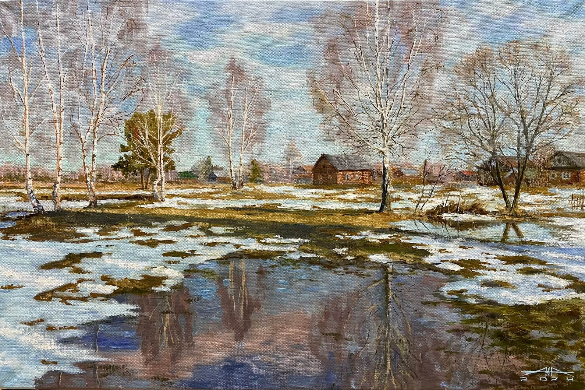 Апрельский день сияет весенним солнцем, под лучами которого тает последний холодный снег, а в лужах отражается весь мир, ликующий от приближения весны. Картина повышает настроение своим оптимистичным сюжетом и лазурными красками. Подойдет для любого интерьера и станет прекрасным подарком для любителей живописи.