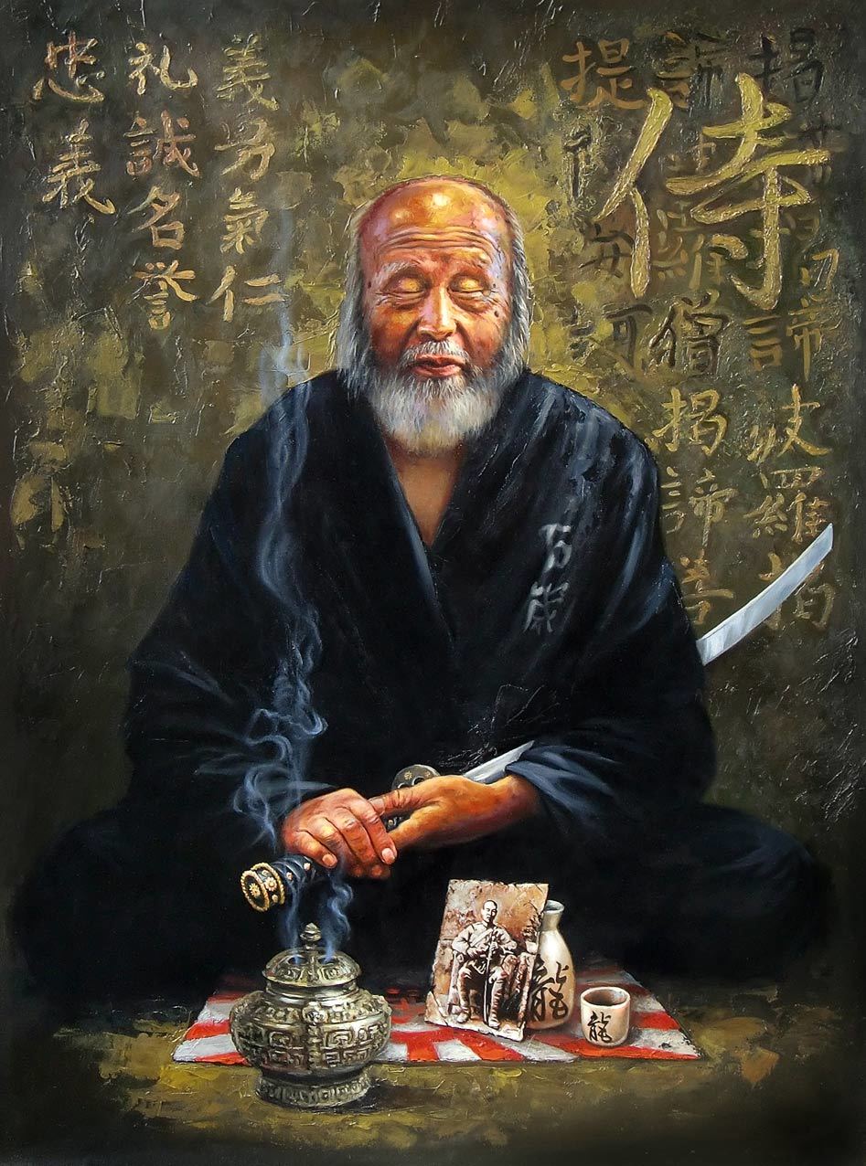 Идея картины принадлежит моему товарищу В.Александрову. Она задумывалась, как сюрреалистическая, но в процессе осталось только обгоревшее лицо старого вояки, да атрибутика... Не понятно, что делает этот старик, спит, медитирует или затаился и бодрствует... Перед ним стоит старая фотография, где он в юности, отправляется на фронт, перед ним лежит головная повязка, которую он сохранил, с красным солнцем - ”Божественный ветер” (значит он был летчик или человек-торпеда), курится лампада (курильница с благовониями именно японская), он медитирует, что-то вспоминает. Рядом маленький сосуд для водки-сакэ. Он правильно держит меч ”катану”, возможно слишком красивую и дорогую, (судя по рукояти для сержантского и офицерского состава). Специально для камикадзе, выпускались простенькие катаны - ”СЁ ГУНТО”, даже с тупыми клинками)... За спиной начертаны правила БУДО - кодекса чести самурая. Именно идею ”самураев” - военной и духовной элиты феодальной Японии специально реанимировали для идеологии войны. Перед войной она была официально запрещена. Среди иероглифов есть знак - ”банзай” - вперед (на груди на кимоно справа) и другие конкретные, а не вымышленные... В раму картины планировалось вставить знак самурая, типа жетона номерного... но рамы пока нет...Если будут вопросы по картине или её приобретению Пишите смс, звоните - обсудим.В Москве доставка по-договорённости, иногородним вышлю.