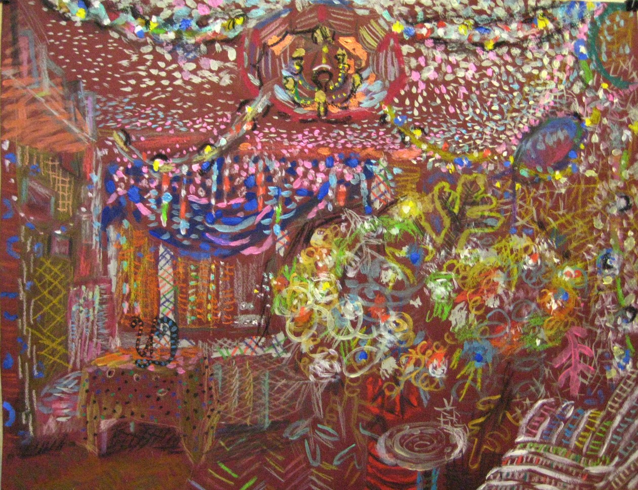 Новогодний интерьер с гирляндами,написан с использованием акриловых красок,масляных мелков,акрила металлик и цветных карандашей на окрашенной в массе фактурной бумаге коричневого цвета.
