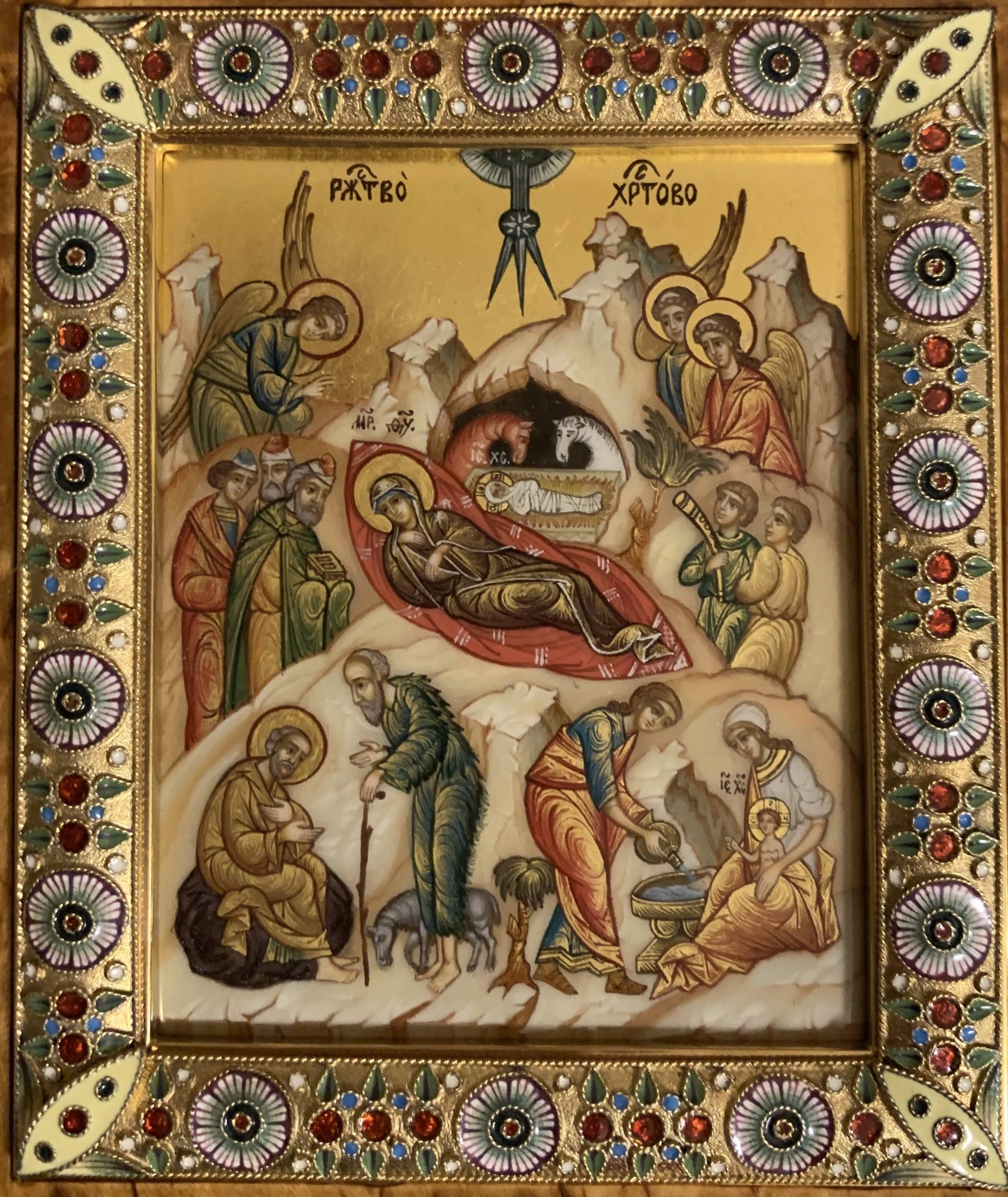 Настольная икона в позолоченном серебряном окладе, украшенный эмалью. Коробка из карельской березы.