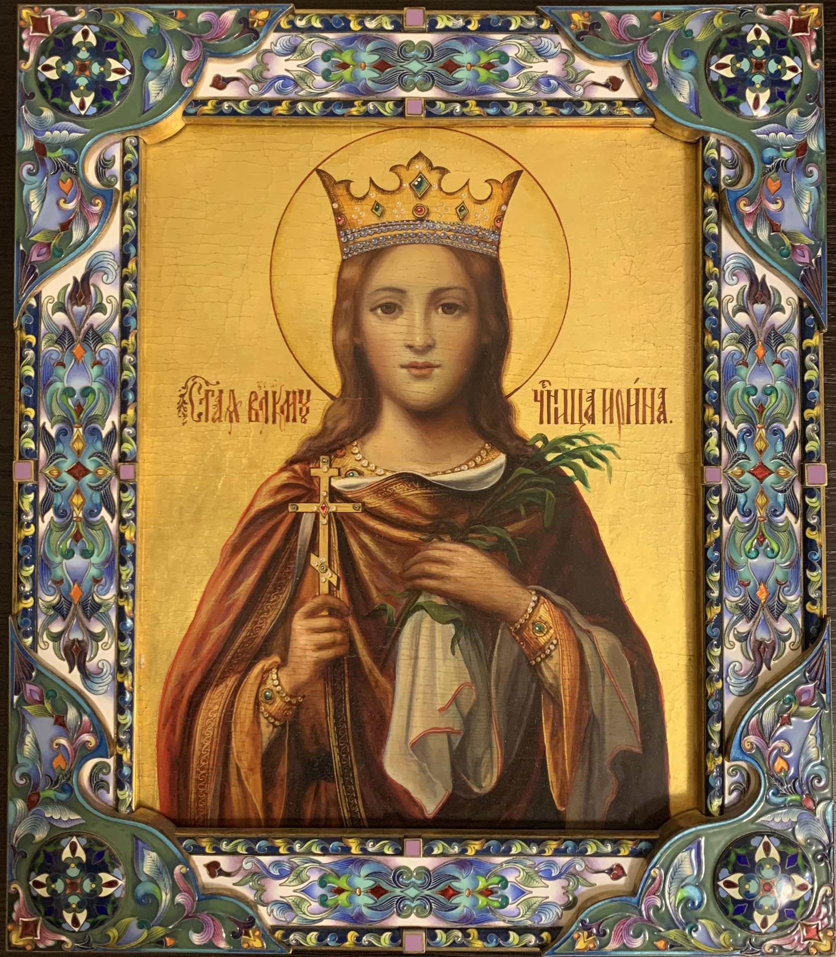 Икона в позолоченном серебряном окладе, украшенном эмалью.