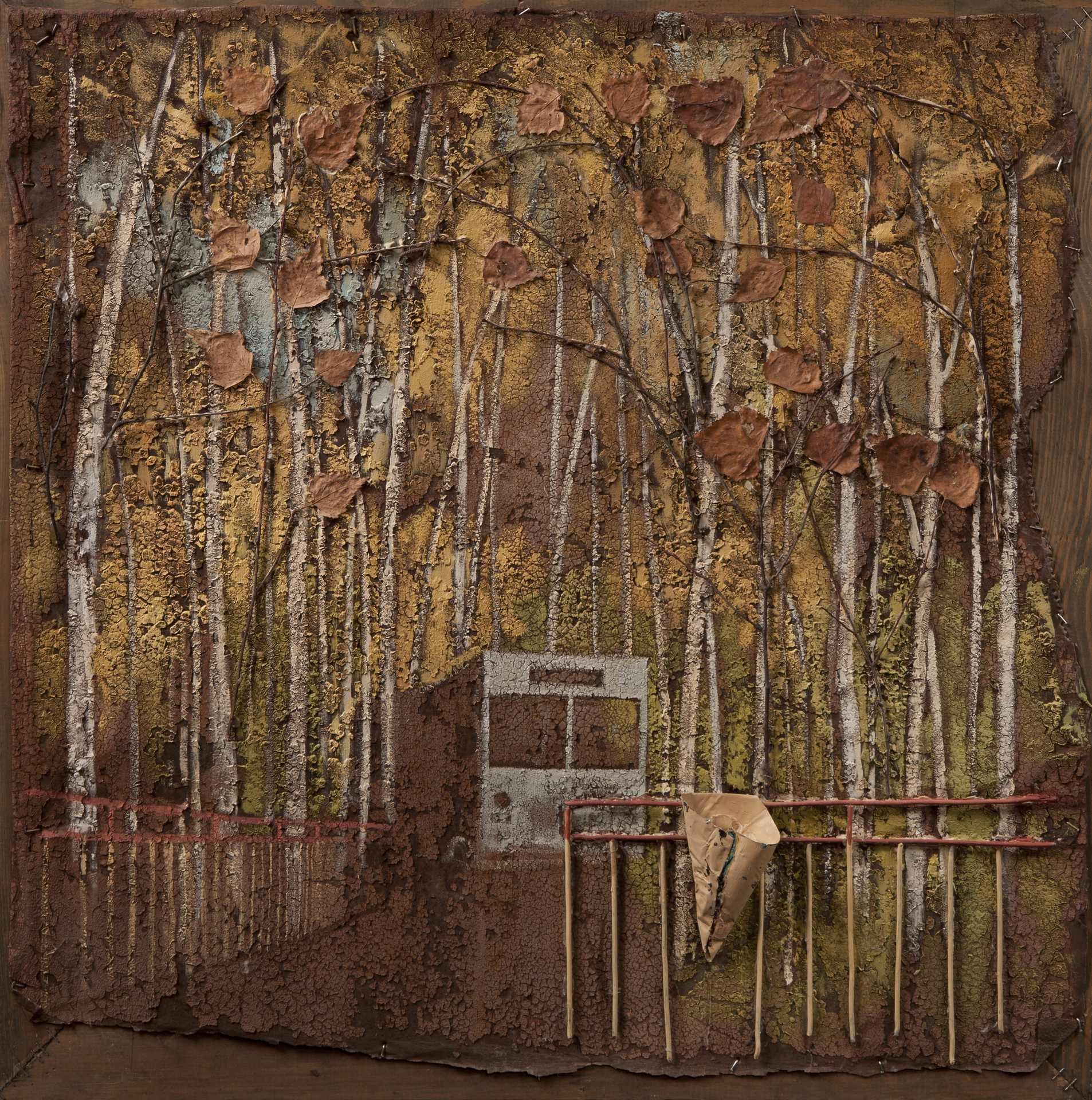Из серии работ на металле, где каждая работа посвящена станции электричек, которую я проезжала каждый день. На станции левобережная прямо за платформой начинался лес. Теперь там плотная многоэтажная застройка.