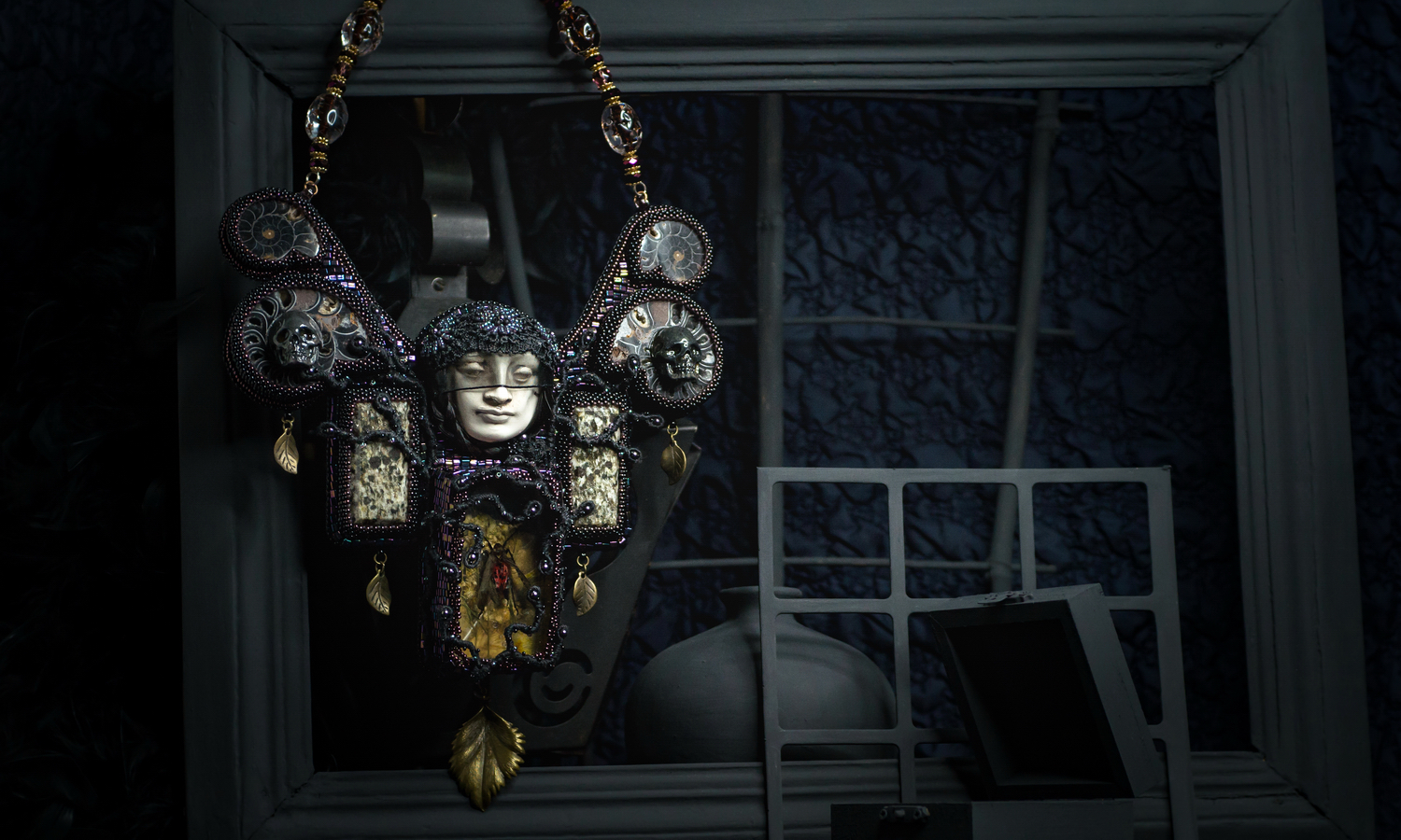 Глубокую, но поистине странную привязанность питал я к Морелле, моему другу. Много лет назад случай познакомил нас, и с первой встречи моя душа запылала пламенем, прежде ей неведомым, однако пламя это зажег не Эрос, и горечь все больше терзала мой дух, пока я постепенно убеждался, что не могу постичь его неведомого смысла и не могу управлять его туманным пыланием. Но мы встретились, и судьба связала нас пред алтарем; и не было у меня слов страсти, и не было мысли о любви. Она же бежала общества людей и, посвятив себя только мне одному, сделала меня счастливым. Ибо размышлять есть счастье, ибо грезить есть счастье. (Эдгар По, "Морелла") Колье продолжает серию "эдгаровских" девушек, на которую меня вдохновили новеллы и стихи Эдгара По. Что нам известно о Морелле? Она - адепт тайных знаний. Ее взгляд завораживает главного героя, ее голос опутывает его. Но он ее не любит, и чем дольше живет с ней, тем больше она его пугает. Она поймала и поглотила его, как паук - муху. Он жаждет ее смерти, и она умирает, только это не приносит ему свободы; наоборот, ее смерть еще больше порабощает его душу, он становится затворником на грани безумия. Здесь почти каждый материал обладает своей символикой: Черепа - momento mori Аммониты - символ бесконечности Фарфоровое лицо - это сам персонаж Морелла Волосы - отсылка к "памятным" украшениям викторианской эпохи Насекомое в смоле и обвивающие черные веточки - это воздействие Мореллы. Это колье полностью смысловое. Оно может стать выражением вашего настроения, жизненного кредо или любви к произведениям Эдгара По:) Колье выполнено в технике вышивки бисером, с применением натуральных камней, обратная сторона подшита натур.кожей, собрано на бусы из стеклянных кристаллов и прозрачных акриловых бусин. Размер:  Длина по центру вниз: 14,5 см Ширина по центру (где крупные аммониты): 20 см Возвышенность в центральной части: 3,5 см Сзади дополнено цепочкой-удлинителем, универсально по окружности шеи.