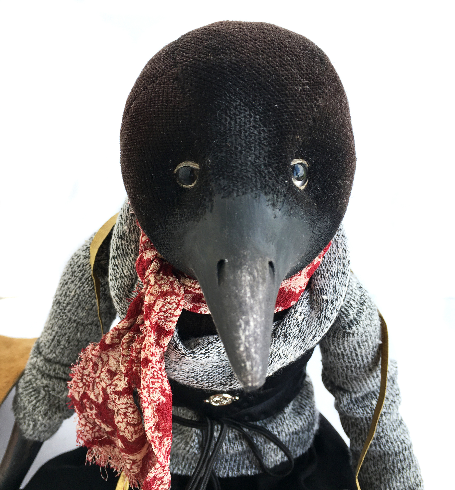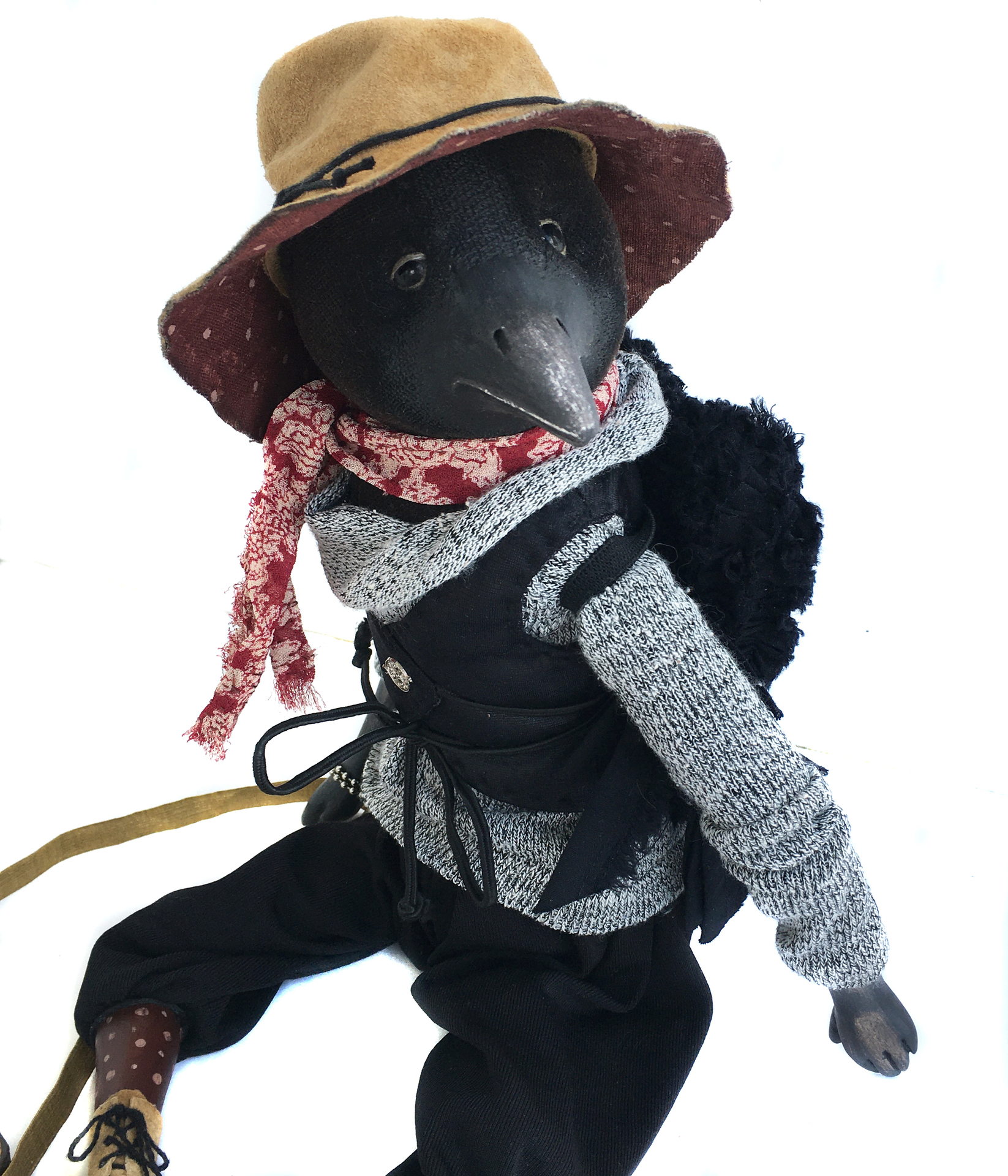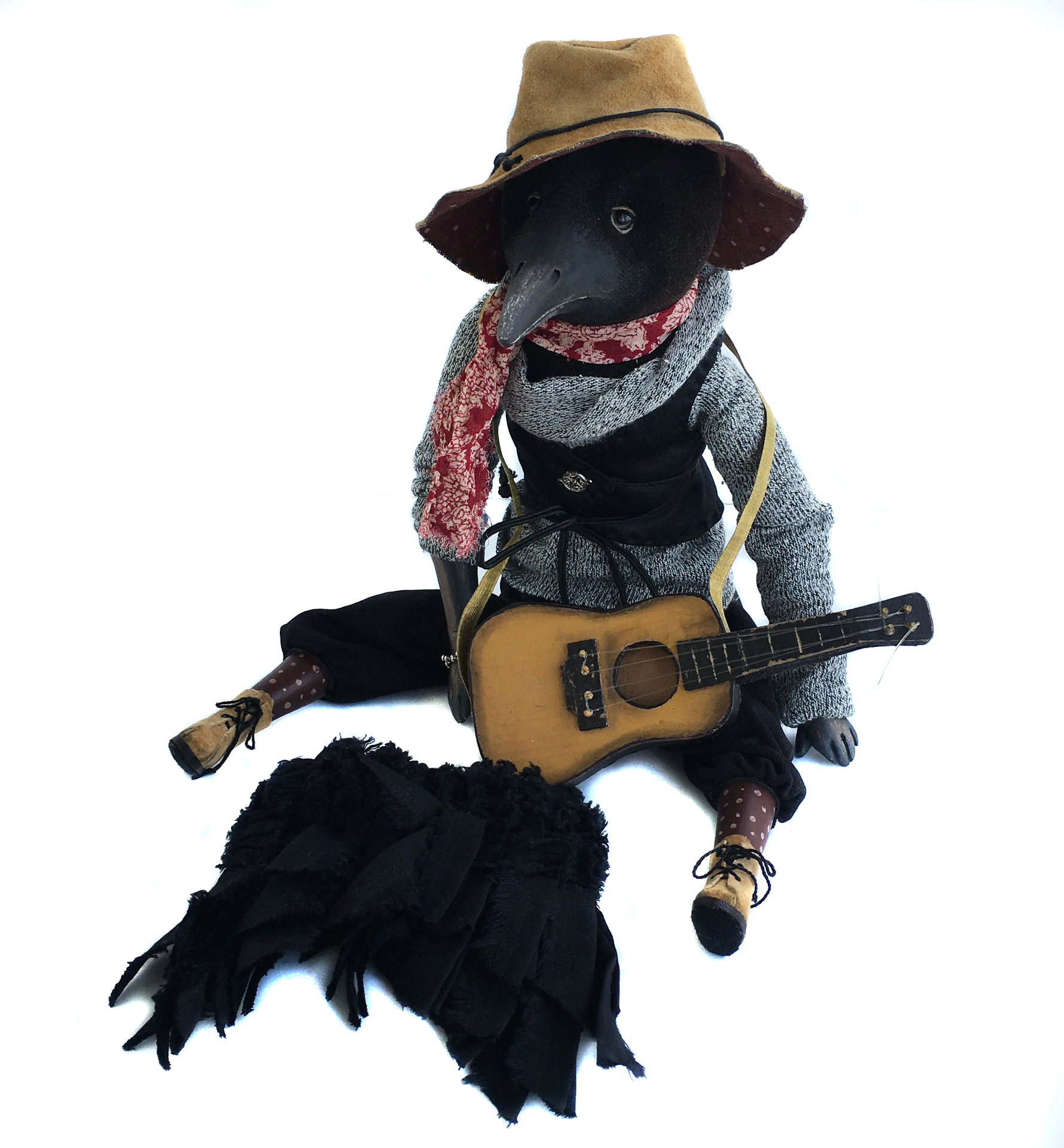 Будуарная авторская кукла Ворон-музыкант Карл.Голова -из винтажного бархата,на шплинтовом креплении(подвижная).Клюв,руки и ноги - пластик Ladoll.Роспись акрил,лак.Свитер,штаны и ботинки несъемные.Жилет,шляпа, шарф и КРЫЛЬЯ съемные.Гитара в придачу. Рост - 40 см,сидя - 24 см.Тело и голова набиты опилками и утяжелено металлическим гранулятом.Глаза-стекло.Одежда - трикотаж.Ботинки и шляпа - натуральная замша.