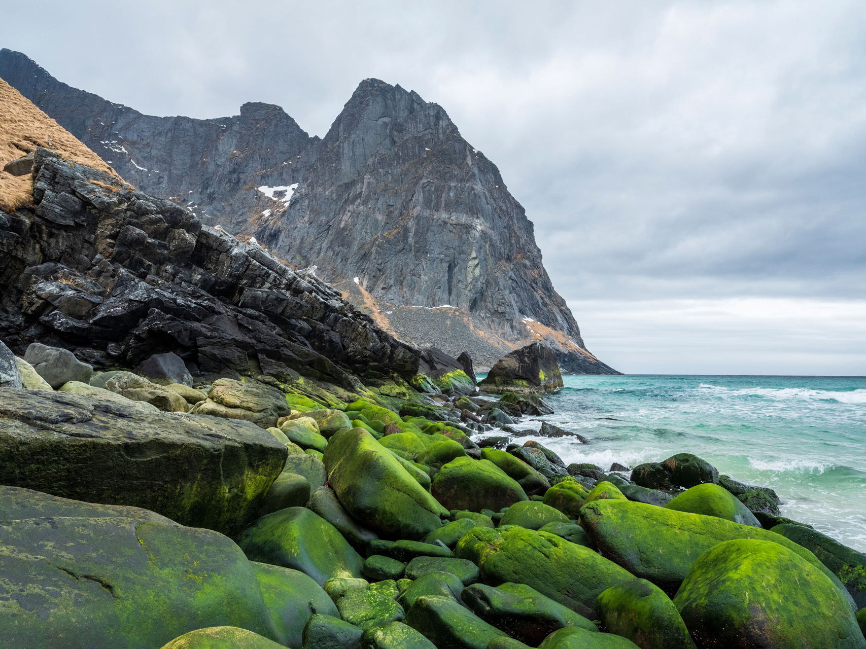 Зеленые камни пляжа Квалвика, Лофотенские острова, Норвегия