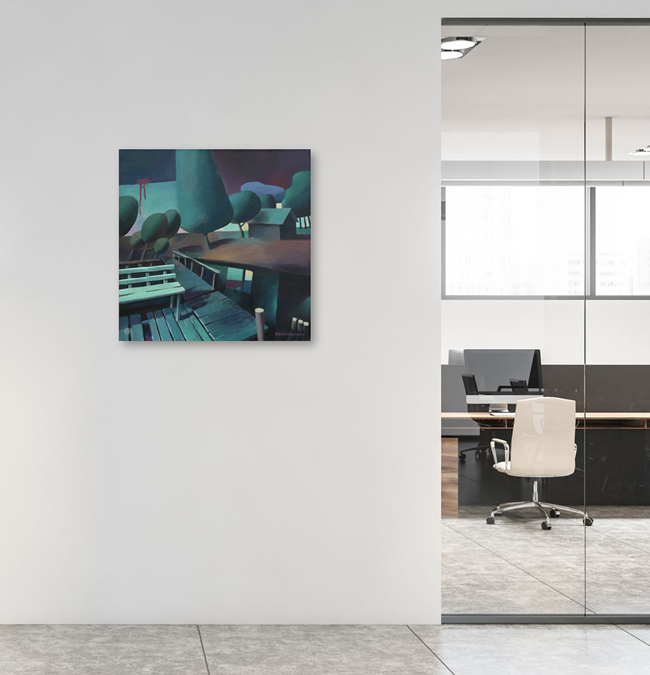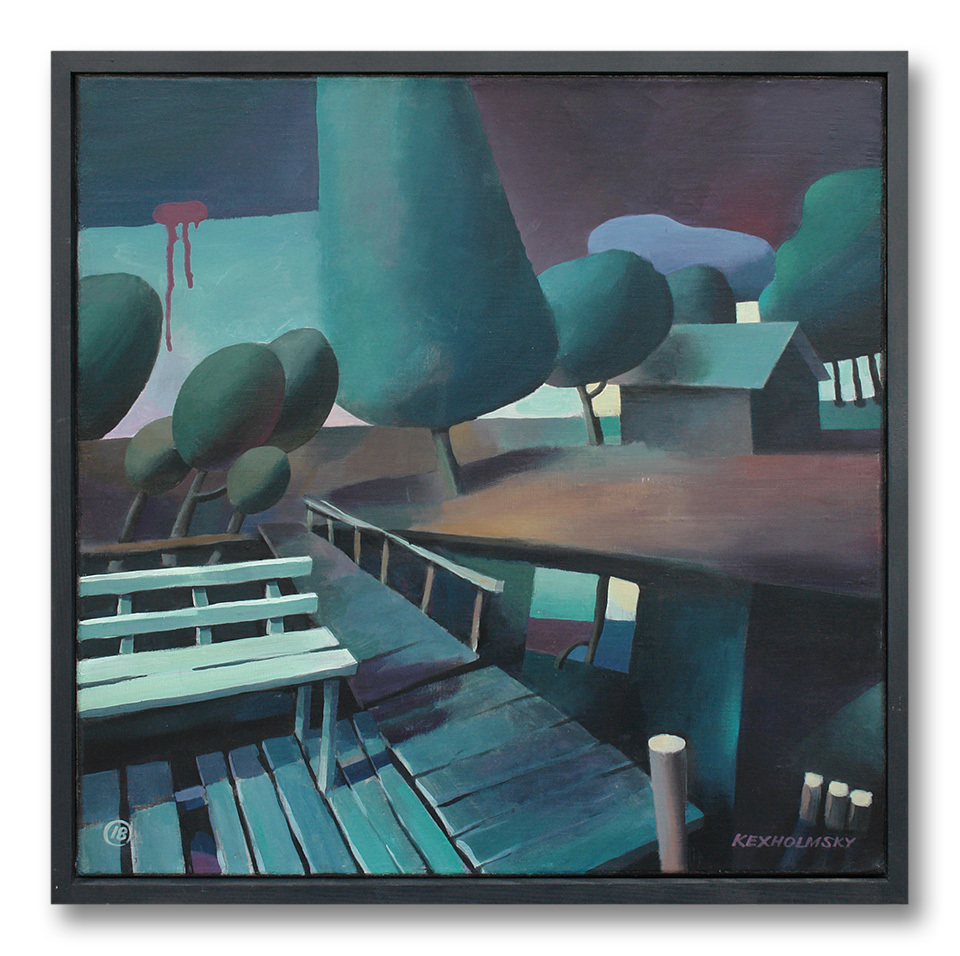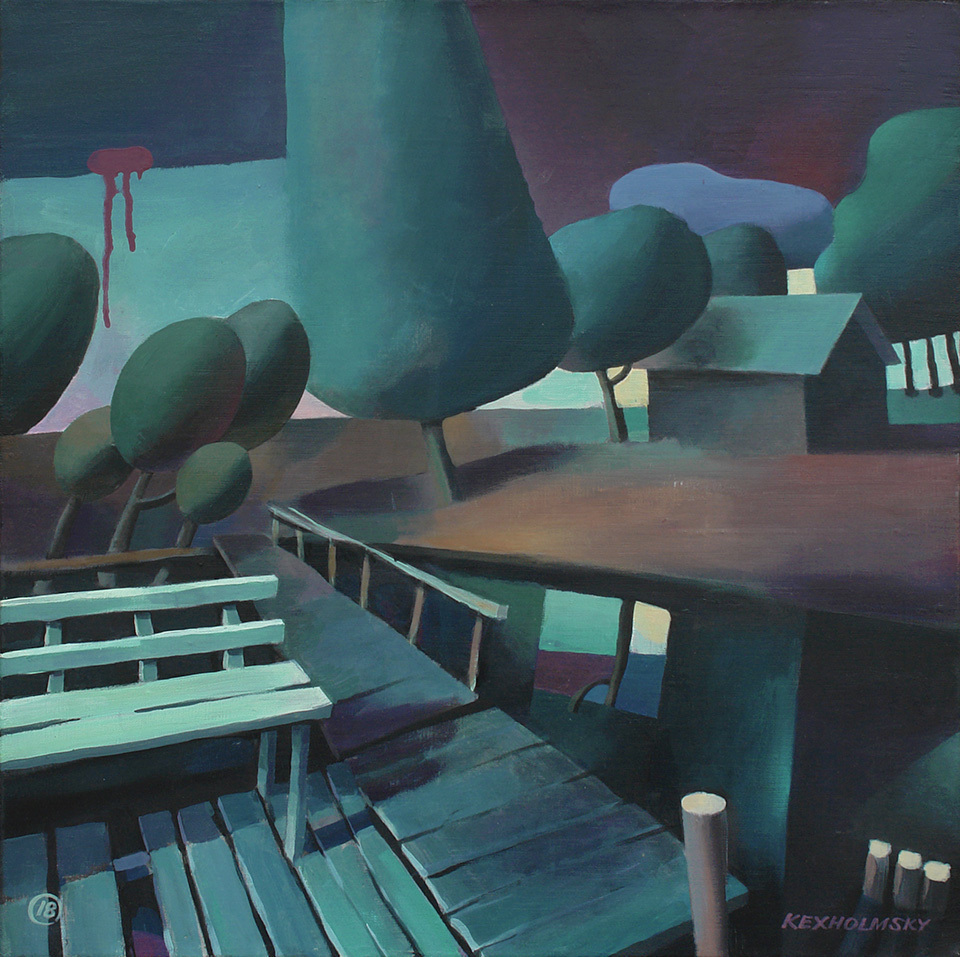 Таинственный берег озера с белой скамьей. Это сон, в котором ты попадаешь в незнакомую местность и смотришь с любопытством, сканируешь это пространство. Скорее всего, здесь ночное освещение и пустынность. И во сне, и в картине - полное отсутствие кого бы то ни было. Это просто пространство, которое или оживёт, что вряд ли, или же там кто-то появится, что тоже большой вопрос. Это экзистенс. Такая белая экзистенциальная скамья.
