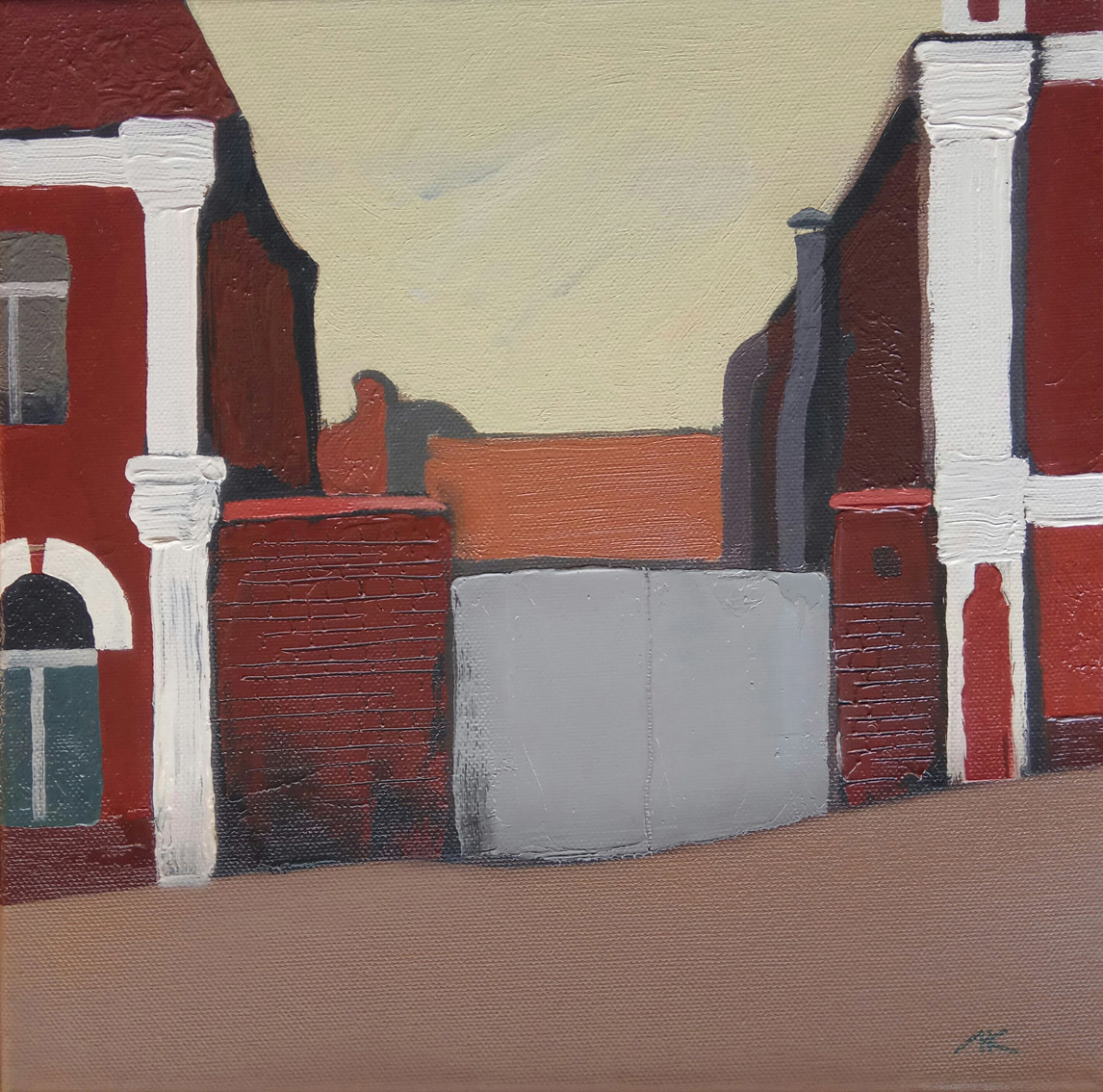 Работа из серии "Проходная" представляет зрителю вид на ворота территории бывшей немецкой фабрики в центре Москвы на улице Радио.