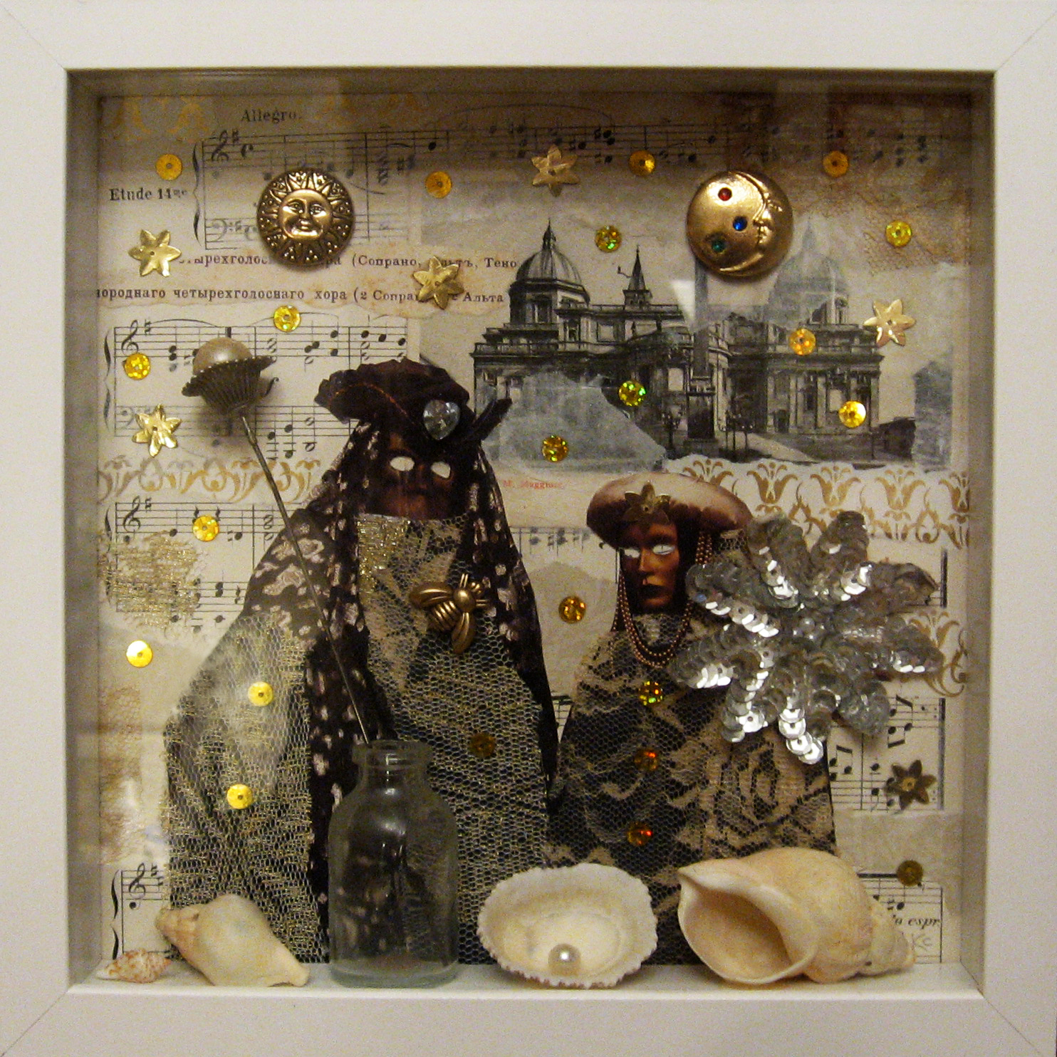 • Техника: картон, бумага, открытки, ноты, кружево, предметы