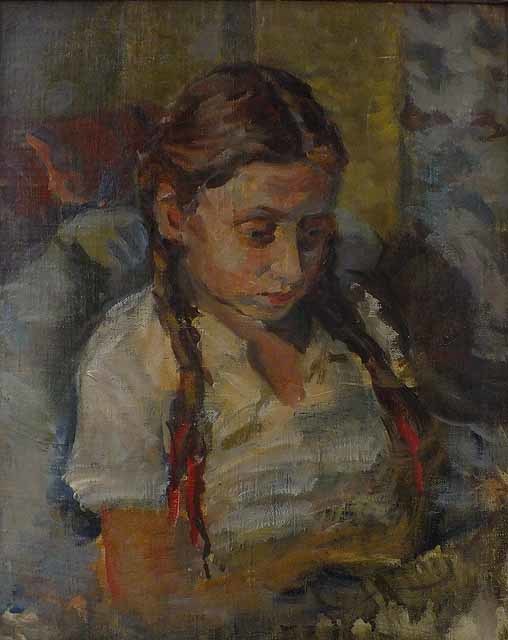 Портрет дочери, написанный незадолго до призыва Евгения Окса на военную службу художником в городской военкомат. СВЕДЕНИЯ О ХУДОЖНИКЕ: Окс Евгений Борисович, (1899, С-Пб -1968, Москва), художник, поэт, литератор 1920-х - 1960-х гг. Родился и учился в Санкт-Петербурге, в 1918-1919 гг жил и продолжил учебу в Одессе, в 1921 г. жил и работал в Кронштадте, с 1922 г и до конца жизни - в Москве. Ученик М.Добужинского, В.Яковлева, В.Шухаева, Бершадского. Участвовал в выставке группы НОЖ в 1924 г., на рубеже 20-х - 30-х гг. член и профорг АХРР, в 1932 г. делегат 1 Съезда художников СССР. Участник Гражданской (боец РОСТА), очевидец (участник?) Кронштадтского мятежа 1921 г., Финской и Великой Отечественной войн (там и там боец отдела изопропаганды Политуправления РККА), участник обороны Москвы в 1941-42 гг.. Активно выставлялся по 1939 г., затем был мобилизован в армию, демобилизован по болезни в 1943. В художественную жизнь вернулся в 1944 г., сдавал работы в фонд РОСИЗО, судьба многих этих произведений неизвестна. Многие годы работал художником-оформителем различных центральных журналов. В свете решений Октябрьского (1964 г.) Пленума ЦК КПСС ему были предоставлены 2 персональные выставки в Москве (1964 и 1965 г.). Умер в Москве осенью 1968 г. В творческом наследии Евгения Окса - не менее 3-5 выдающихся работ-символов своего времени ("Новый 1932-й год" (1932), "Красный трамвай" (1934, находится в ГТГ), "Послевоенная жизнь. В деревне. На огородах" (2 больших картины, 1947, частные коллекции), "Дорога в Хорошеве" (эскиз пророческой силы, 1961, частная коллекция). Из ранних работ высокого уровня достигают "Автопортрет на красном фоне" (1924, частная коллекция), "Зима. Москва, Собачья площадка" (кон.1920-х, частная коллекция), "Арбатские переулки. Розовый забор" (нач.1930-х, частная коллекция). В 1946 - 1947 гг. с группой московских живописцев организовал художественное направление лирических пейзажистов "Московский Барбизон" в д.Измалково, отчетная выставка в конце 1947 г. не состоялась по причине изменения политической ситуации. Основное направление творчества - лирический городской и сельский пейзаж импрессионистского толка, портрет. Художественные работы, кроме сдаваемых в РОИЗО, с конца 1940-х гг. хранились в семье, на выставки и аукционы вернулись в 1990-г., с тех пор активно выставляются на различных площадках и приобретаются коллекционерами. Имя художника Е.Окса ныне полностью возвращено в историю отечественного искусства. В творческом наследии Е.Окса также есть стихотворные произведения 1919 - 1950-х гг., дневники и воспоминания о творческой жизни предреволюционных и революционных лет, об Одесском "Клубе Поэтов", участником которого он был в 1919 г. вместе с Ю.Олешей, Эд.Багрицким, И.Ильфом, Ад.Адалис. Художниками стали дочь, Людмила Евгеньевна Окс (1931-2013) и внучка Ольга Анатольевна Окс.