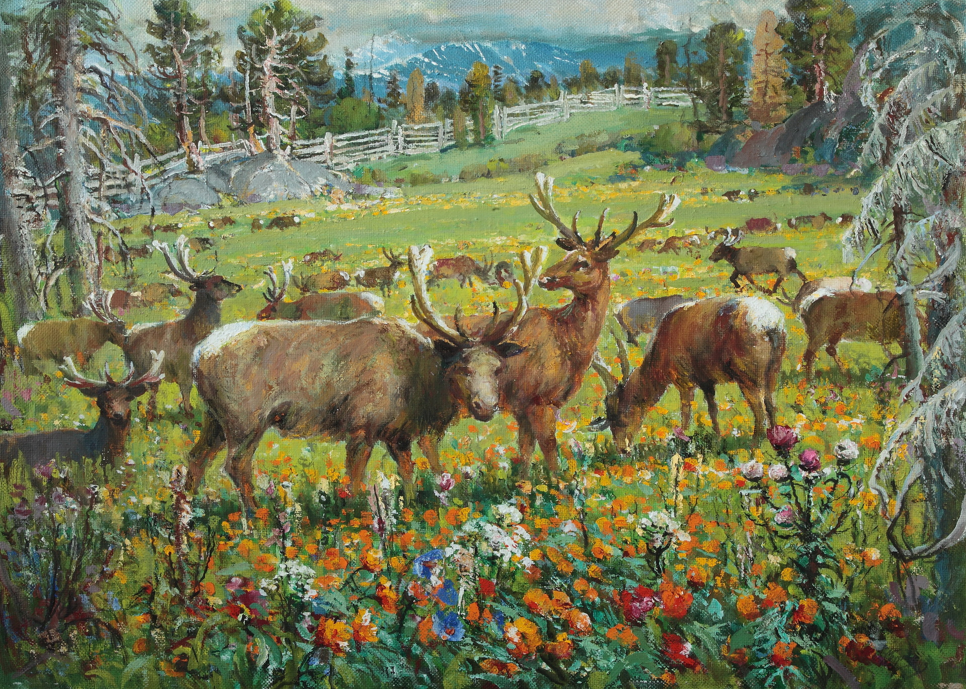 Маральник - ферма, на которой содержатся маралы (алтайские олени), пасущиеся летом на воле, и приходящие на ночь в стойло. Из рогов маралов добывают целебный пантокрин. Картина написана в районе села Шебалино, 2013 г., горный Алтай. Там находится крупнейший мараловодческий комплекс. Цветы Огоньки (Купа́льница азиа́тская, или огонёк азиа́тский) — травянистое многолетнее растение рода Купальница семейства Лютиковые. Распространены на Алтае в районах альпийских лугов.