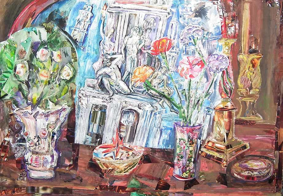 СВЕДЕНИЯ О ХУДОЖНИКЕ: Окс Ольга Анатольевна (род. 1961, Москва), российская художница, видный представитель современного отечественного экспрессивно-авангардного искусства. Дочь Людмилы Евгеньевны Окс (1931-2013) и внучка Евгения Окса (1899-1968). Училась в московской художественной школе, затем несколько лет провела в больнице, ставшей первой темой ее творчества. Работа из этого цикла «Вид из больничного окна. Груз не-200» в 2016 г. экспонировалась на выставке в ГТГ. В 1980-х участвовала в движении хиппи, контактировала с группой художников объединения на Малой Грузинской, затем активно участвовала волонтером в религиозной просветительно-благотворительной организации «Свет и Вера». Неоднократно выставлялась в галерее «На Малой Грузинской», где познакомилась со своим мужем Александром Рогинским, творчество отца которого, художника-нонконформиста 1960-х гг. Михаила Рогинского оказало большое влияние на тематику ее последующих работ. В это же время складывается и стиль-«ноу-хау» ее работ — экспрессивный коллаж из газетных и журнальных вырезок в виде мозаики, дополняемой акварелью, гуашь., в последние годы – маслом. После изменения характера деятельности «Малой Грузинской» выступает как самостоятельный художник, в 1990-х – начале 2000-х гг. — социальной направленности. Наиболее представительны ее циклы «Соц-Арт на газетах» и «Москва — Третий Рим». Ряд работ был включен в программу-турне современного российского искусства по США, организованную А.Глезером. В 2000-х гг. начинается наиболее представительная серия ее работ общим числом более 50-ти — шаржированных портретов кумиров эстрады «Эстрадиада», неоднократно представлявшаяся на различных выставках. Сердцевиной цикла является серия, посвященная певцу Валерию Леонтьеву, ряд работ из которой находится в собрании артиста и украшает его дом в Майами (США). В это же время она участвует в работе «Салона Всех Муз» Анны Коротковой, где выступает с программами разговорного жанра и сценической эксцентрики, а также с шоу дизайнерских моделей подиумной одежды. Работы Ольги Окс охотно приобретают российские и зарубежные коллекционеры, галереи и музеи часто приглашают ее участвовать в выставках, в т.ч. проводят ее персональные выставки.
