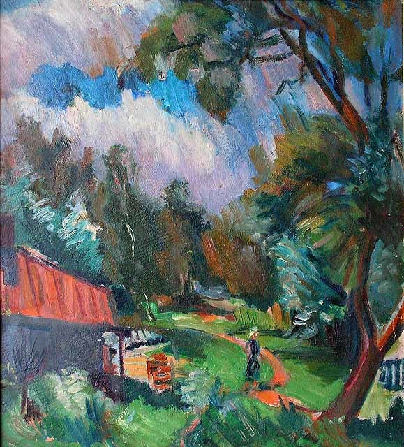 Пейзаж, созданный в духе "настроения времени", не без влияния незадолго до того прошедшей в Москве выставки работ немецких художников, бежавших от установившегося в Германии фашистского режима. СВЕДЕНИЯ О ХУДОЖНИКЕ: Окс Евгений Борисович, (1899, С-Пб -1968, Москва), художник, поэт, литератор 1920-х - 1960-х гг. Родился и учился в Санкт-Петербурге, в 1918-1919 гг жил и продолжил учебу в Одессе, в 1921 г. жил и работал в Кронштадте, с 1922 г и до конца жизни - в Москве. Ученик М.Добужинского, В.Яковлева, В.Шухаева, Бершадского. Участвовал в выставке группы НОЖ в 1924 г., на рубеже 20-х - 30-х гг. член и профорг АХРР, в 1932 г. делегат 1 Съезда художников СССР. Участник Гражданской (боец РОСТА), очевидец (участник?) Кронштадтского мятежа 1921 г., Финской и Великой Отечественной войн (там и там боец отдела изопропаганды Политуправления РККА), участник обороны Москвы в 1941-42 гг.. Активно выставлялся по 1939 г., затем был мобилизован в армию, демобилизован по болезни в 1943. В художественную жизнь вернулся в 1944 г., сдавал работы в фонд РОСИЗО, судьба многих этих произведений неизвестна. Многие годы работал художником-оформителем различных центральных журналов. В свете решений Октябрьского (1964 г.) Пленума ЦК КПСС ему были предоставлены 2 персональные выставки в Москве (1964 и 1965 г.). Умер в Москве осенью 1968 г. В творческом наследии Евгения Окса - не менее 3-5 выдающихся работ-символов своего времени ("Новый 1932-й год" (1932), "Красный трамвай" (1934, находится в ГТГ), "Послевоенная жизнь. В деревне. На огородах" (2 больших картины, 1947, частные коллекции), "Дорога в Хорошеве" (эскиз пророческой силы, 1961, частная коллекция). Из ранних работ высокого уровня достигают "Автопортрет на красном фоне" (1924, частная коллекция), "Зима. Москва, Собачья площадка" (кон.1920-х, частная коллекция), "Арбатские переулки. Розовый забор" (нач.1930-х, частная коллекция). В 1946 - 1947 гг. с группой московских живописцев организовал художественное направление лирических пейзажистов "Московский Барбизон" в д.Измалково, отчетная выставка в конце 1947 г. не состоялась по причине изменения политической ситуации. Основное направление творчества - лирический городской и сельский пейзаж импрессионистского толка, портрет. Художественные работы, кроме сдаваемых в РОИЗО, с конца 1940-х гг. хранились в семье, на выставки и аукционы вернулись в 1990-г., с тех пор активно выставляются на различных площадках и приобретаются коллекционерами. Имя художника Е.Окса ныне полностью возвращено в историю отечественного искусства. В творческом наследии Е.Окса также есть стихотворные произведения 1919 - 1950-х гг., дневники и воспоминания о творческой жизни предреволюционных и революционных лет, об Одесском "Клубе Поэтов", участником которого он был в 1919 г. вместе с Ю.Олешей, Эд.Багрицким, И.Ильфом, Ад.Адалис. Художниками стали дочь, Людмила Евгеньевна Окс (1931-2013) и внучка Ольга Анатольевна Окс.