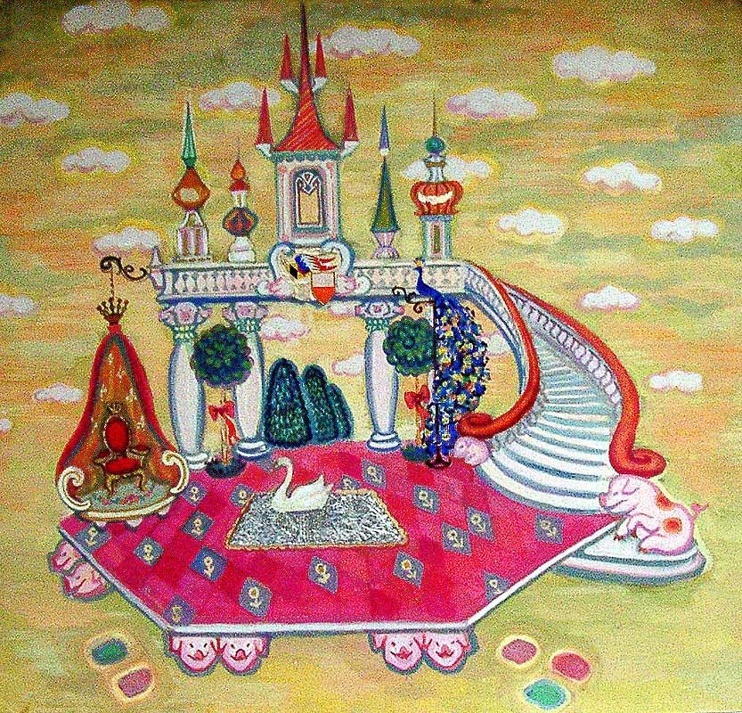 Эскиз к телевизионному мультфильму, созданный в период работы художницы на Центральном Телевидении СССР. Окс Людмила Евгеньевна (1931 – 2013, Москва), художник театра и телевидения, дочь художника 1920-х – 1960-х Евгения Борисовича Окса. Родилась в Москве, училась в московской художественной школе «Чудовке» и Московском художественном училище памяти 1905 года по профилю «театрально-декорционное искусство». С 1954 по 1957 гг. работала в Куйбышевском областном театре оперы и балета, где стажировалась у знаменитого Б.М.Эрбштейна, где была автором декораций к балету «Бахчисарайский фонтан», опере «Чио-Чио-Сан» и ряду других постановок. В 1957 г. в Ленинграде по приглашению Эрбштейна совместно с ним оформляла спектакль «Конец Криворыльска». Далее несколько лет оформляла драматические спектакли в разных театрах. С середины 1960-х по конец 1980-х гг. работала художником-постановщиком на Центральном Телевидении. В ее декорациях шли литературно-познавательные программы, несколько выпусков КВН и «Кабачка 13 стульев», ряд телеспектаклей, среди них – «Провинциалка» по И.А.Тургеневу. Создала постановочное решение, костюмы и декорации к мульфильму «Ганс-Свинопас» по Г.-Х. Андерсену. Закрытость работы телевидения в те годы потребовала прекращения ее общетворческой деятельности в качестве художника-живописца и участия в непрофильных выставках и т.п. С 1990 г. сосредоточилась на литературно-публицистической и выставочной деятельности по возвращению в историю отечественной культуры и искусства имени и творческого наследия отца, Евгения Окса. В эти годы она выступила как иконописец (ее работы образ Св.Троицы украшает вход в Троицкий храм в Хорошеве в Москве) и написала несколько картин, среди них «Птица-Тройка, Русь». Театральные и телевизионные эскизы и другие работы Л.Окс хранятся в нескольких частных коллекциях в России и за рубежом.