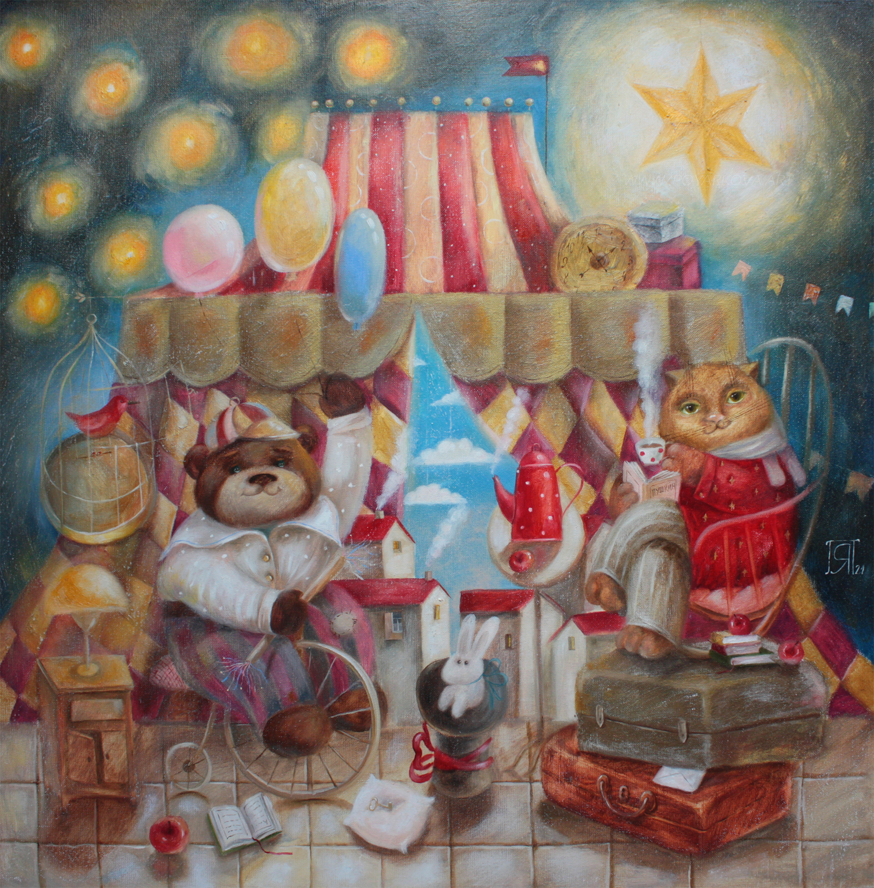 Картина о хорошем настроении, о позитивном мышлении, расслабленности, о хороших друзьях и счастье. Картина с цирком, котом и медведем на велосипеде. Написана маслом на холсте. Подходит для детской комнаты или гостиной.