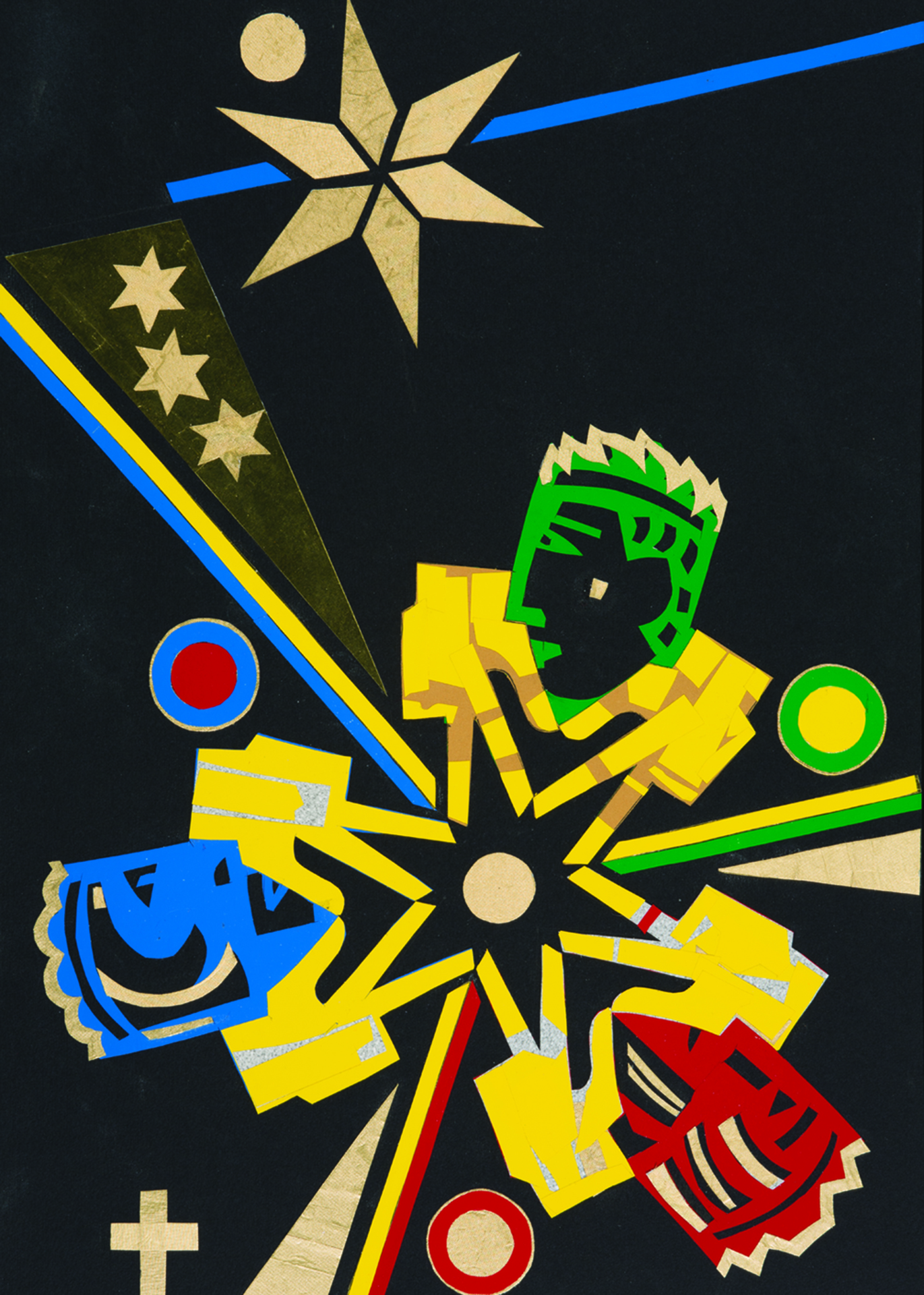 Высоко в небе шестиконечная Звезда, Вифлеемская Звезда, Звезда-вестник -- освещающая путь Волхвов--Царей в их стремлении к чему-то новому и чудесному, к далекому, о чем мечтается. И Звезда – уже не просто Звезда, а символ этого прекрасного и манящего, символ, связывающий возвышенное и земное. Образ, который в поэзии создается словами -- присутствием младенца, перечислением предметов и состояний, как это, например, у Пастернака или Бродского («Внимательно, не мигая, сквозь редкие облака, на лежащего в яслях ребенка издалека, Из глубины Вселенной, с другого ее конца, звезда смотрела в пещеру. И это был взгляд Отца») -- -- художник выстраивает соединением композиции и свето-цветового решения, и дальше, в своей гармонии, этот целостный образ ведет смотрящего вглубь, в смысл – осмысление. По диагонали, через пространство листа плывет Звезда, и ее движение подчеркнуто и усилено как бы подталкивающими ее стрелами и другими звездами, ведущими ее. В то же время эти небольшие звезды -- отблески, умножающие ее свечение, яркое, но величественно-спокойное. Силуэты Волхвов-Царей и их шары-подарки, будто сливаясь с формами Звезды, становясь ее частью, то ли летят за ней, то ли, как некие крылья, несут ее вперед на своих руках и наполняют образ духом возвышенного устремления. Декоративная притягательность образа, слаженность и гармония целого, общее настроение внутреннего покоя и величия создаются из казалось бы противоречивых элементов – соединения заостренных линий и мягких округлостей и, наконец, цвета, интенсивного, смело положенного в простых комбинациях золотисто-желтого с синим, зеленым и красным, который и определяет его смысловую глубину. Муся Гланц. Искусствовед. Бостон.