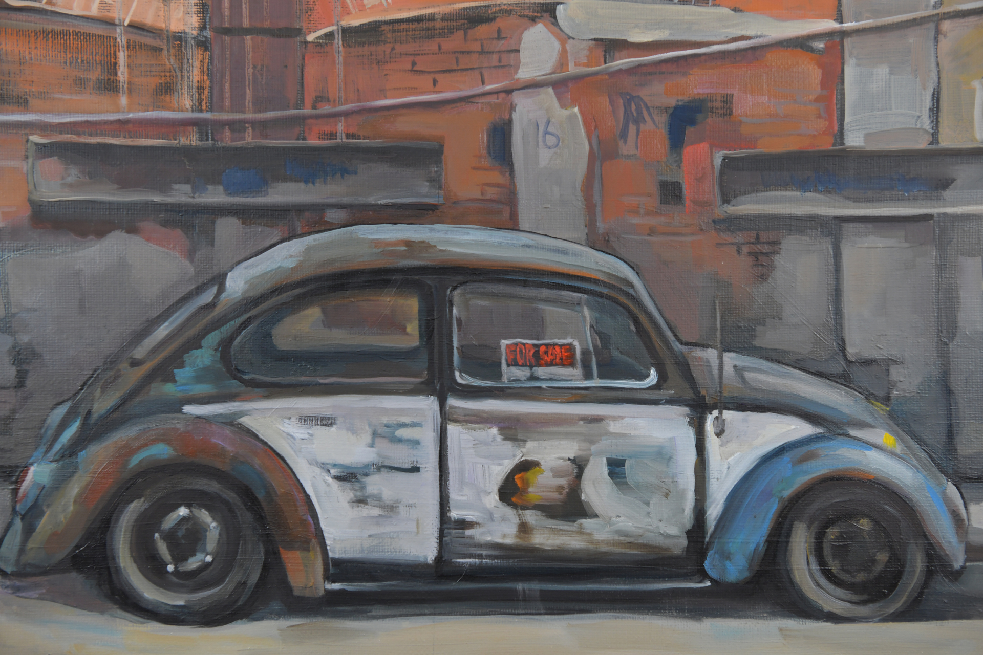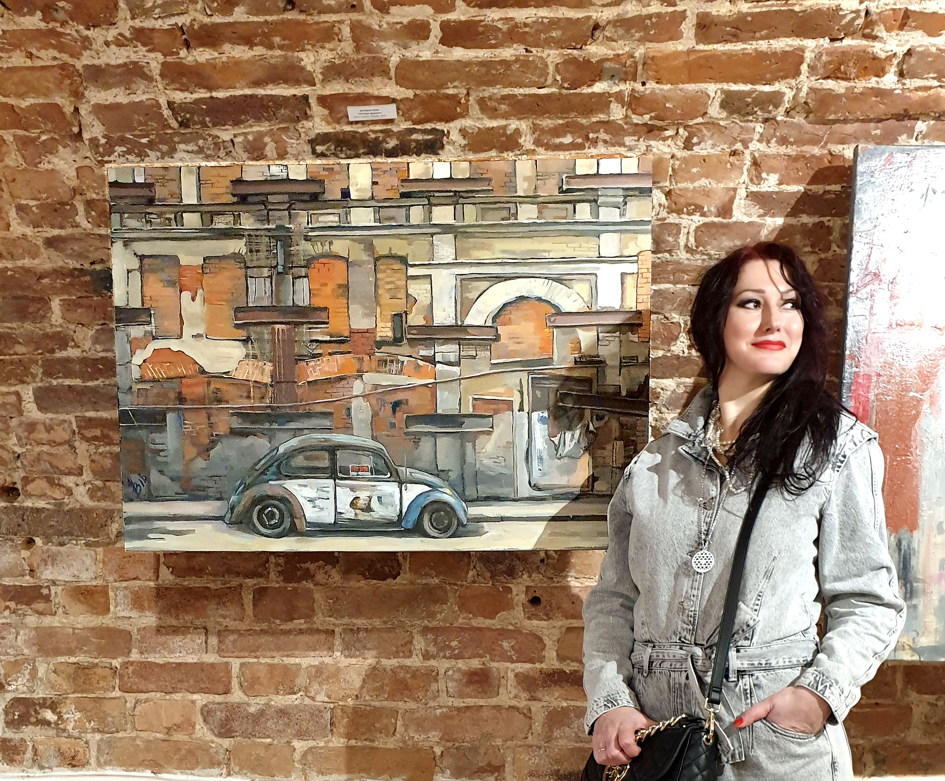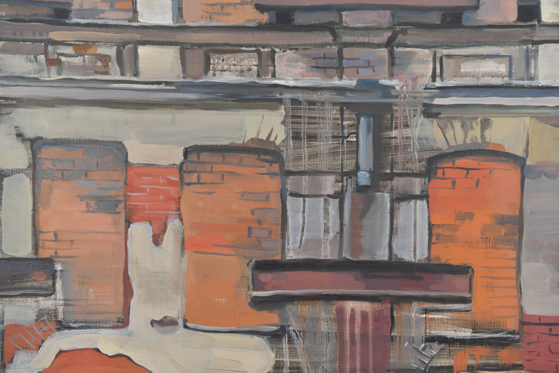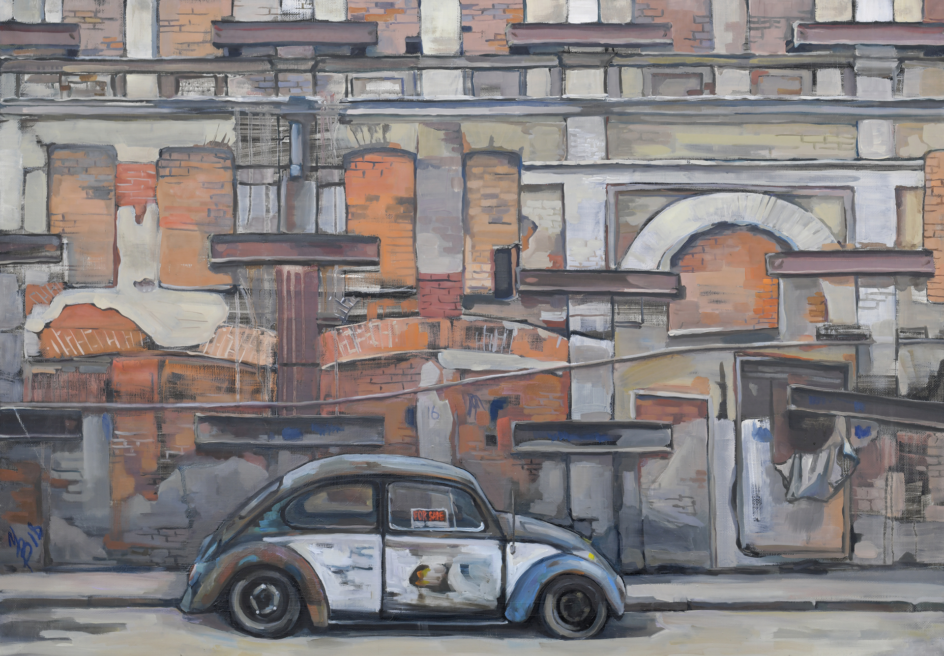 На картине изображена стена Доходного владения Виноградова, Доходный дом с торговыми лавками XIX-XX в, вид со стороны Фалеевского переулка. Сейчас это здание находится на реставрации, обещают полностью восстановить его облик, сложившийся к 1876г. Дом в очень запущенном аварийном состоянии, но красота временных наслоений фасада создает нерукотворную очень живописную фактуру. Ретро автомобиль дополняет композицию и рифмуется с полукругами арок.