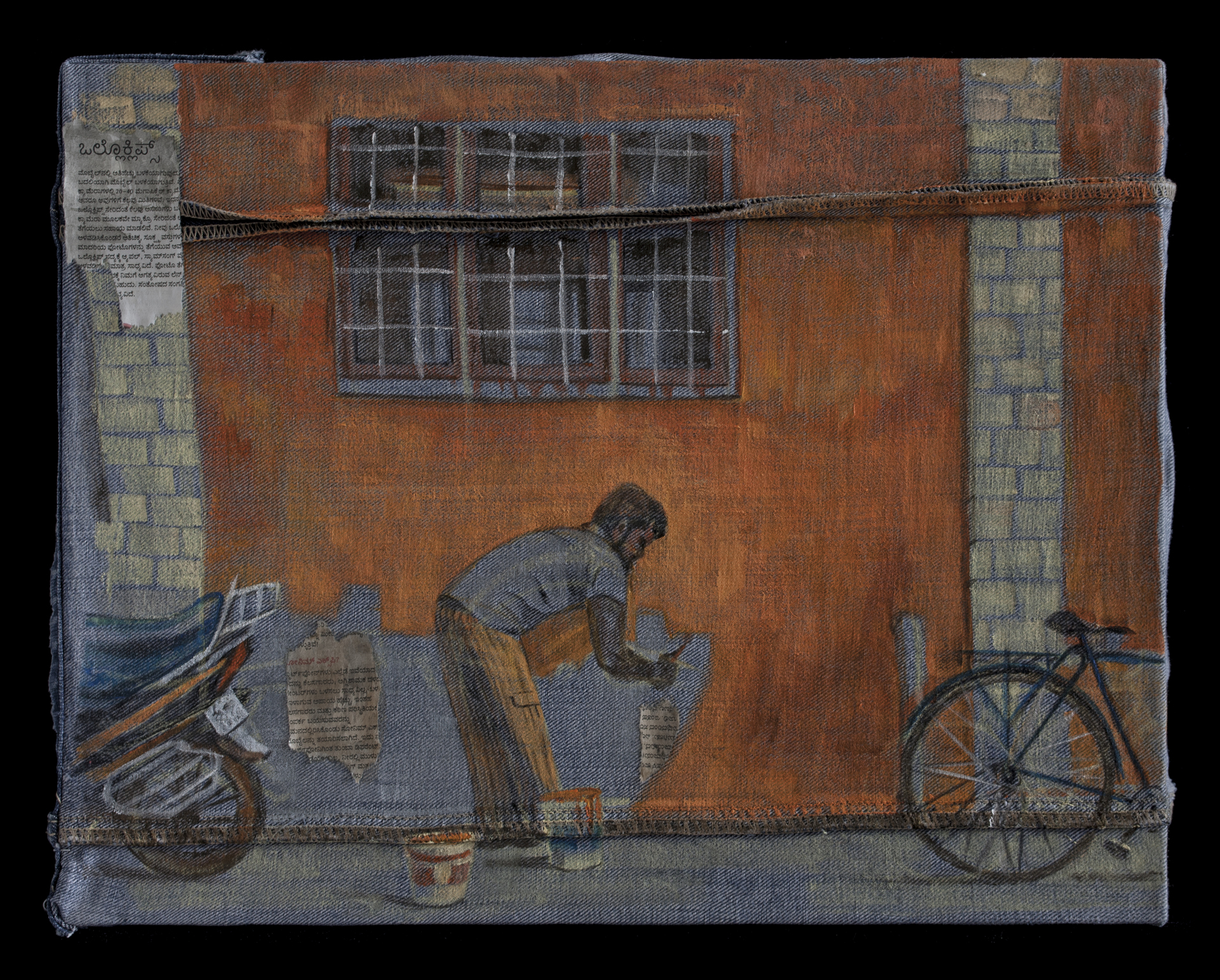 Работа из серии "В дороге" Коллажи на джинсах, отражающие мимолетные и субьективные впечатления от моего пребывания в разных географических точках. Эта работа про Индию. Каждый год, после сезона дождей индийские города потрясающе облезлы и фактурны. Каждый новый сезон начинается с покраски стен в новые кислотные цвета. Но так как краска состоит из порошка и водички, а дожди льют серьезные, через год все будет таким же облезлым и фактурным.