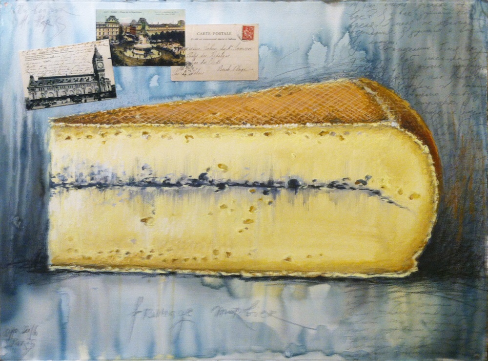 Работы из серии «Путешествие гурмана» сделаны в Париже. Натолкнула меня на мысль открытка, найденная на набережной у букинистов и собственная страсть к рассматриванию и наслаждению едой. Я была в Париже как раз во время наводнения 2016 и купила открытку с великим наводнением 1910 г. И что же пишет в то время милая Бланш своей тёте? Моя дочка хорошо ест, и её не надо теперь шлепать, чтобы она пила. Она поправилась на 200 гр, и еще что-то про новую кормилицу. О наводнении ни слова, а она же его наверняка видела) только фото на отправленной ею открытке. Житейские дела, еда, всё как сейчас. Большой мир вокруг и маленький мир своего дома. Дальше остановить безудержное желание покупать открытки было невозможно. Каждый день я приходила с «уловом». Полки в моей мастерской скоро все заполнились видами Парижа столетней давности, ну и новостями столетней давности. Без текста открытки покупать уже было неинтересно. Пусть там всего лишь написано – «Привет из Парижа», «Мои нежные поцелуи» или еще какой-нибудь пустяк. Это трогало меня каждый раз, нынче никто не пишет и не посылает открыток. Мы видим, как кто-то из наших друзей «зачекинился» в Риме или Казани, но это не личное, не личное! Не «salut chaleureux», не «baiser ardent», которые переживут на открытке сто лет, две войны и переедут из Парижа в Москву. Погода в июне 2016 всё не налаживалась. Наводнение, дожди, холод. Желание выйти на этюды так и осталось желанием. Но у меня мастерская в Париже!!! И Париж вот он, вокруг. Так что милая Бланш и правда через сто с лишним лет побудила меня к работе))) Где я попробовала первый раз артишоки? А белую спаржу? А какие устрицы на Marche de Bastille! Вот это и стало темой для работы. Что такое еда для меня? Это воспоминания. Поездок, как сейчас, или детства, или какого-то момента, переживания. Так что, когда я пишу еду, я работаю с воспоминаниями. «А бабушка в полдник мне давала кефир. Бабушки нет, а это помню». «У нас всегда на Новый год готовили Оливье, и вся была семья за столом». «Какой прекрасный кофе был в кафе на Монмартре». Видим, вспоминаем, храним. Помним запах и вкус, настроение и ощущение той ушедшей минуты.