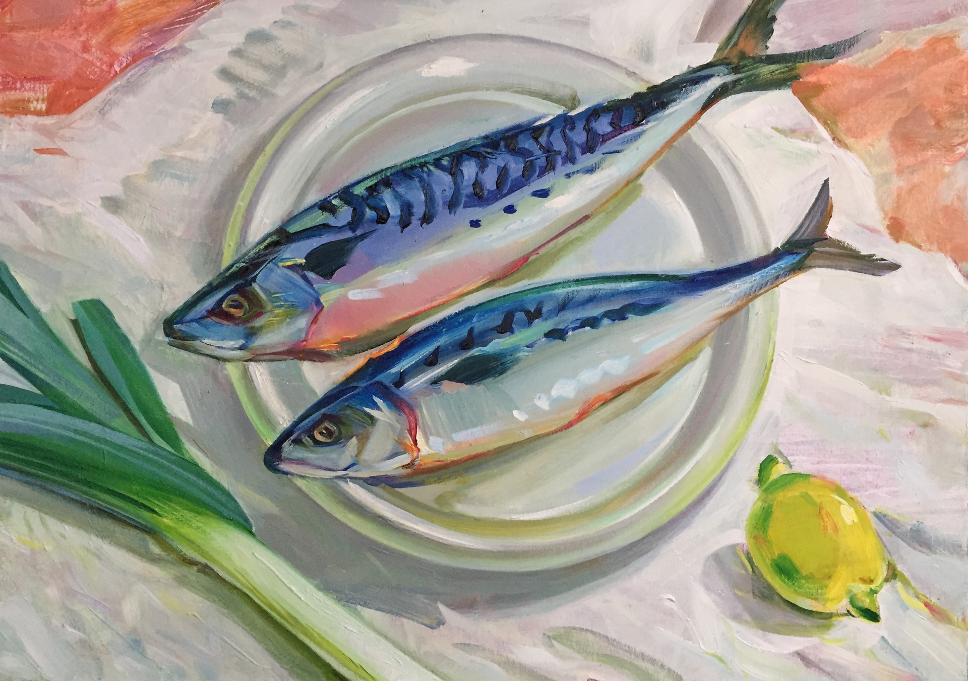 Скумбрия на белой тарелке, порей, лимон и драпировка.