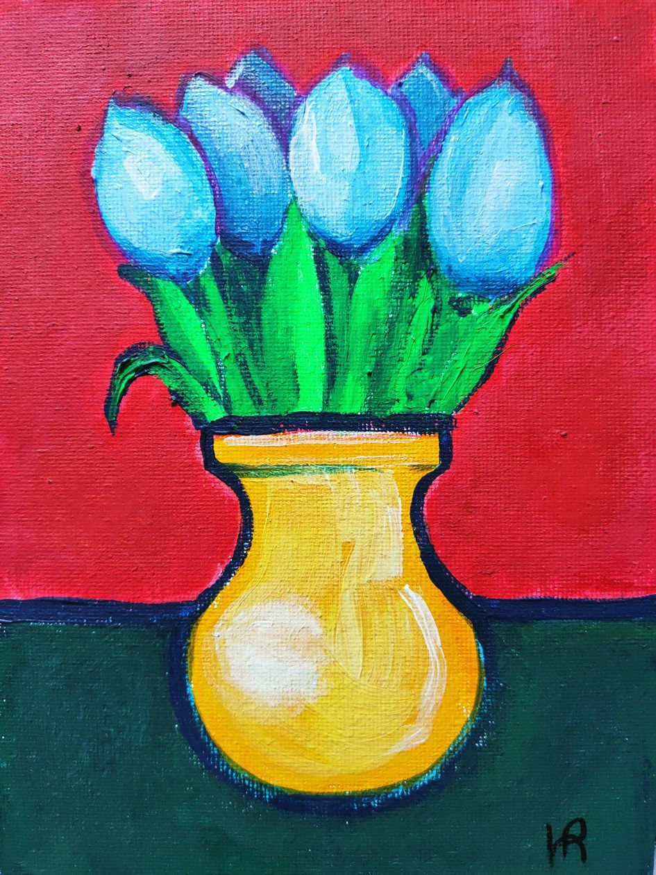 Лазоревые тюльпаны с хрустящими листьями, свежесть которых оттеняют плотные тяжелые цвета фона и скатерти. Короткое видео с данной работой можно посмотреть по ссылке https://www.facebook.com/ivanova.rin/videos/2356607714396385/