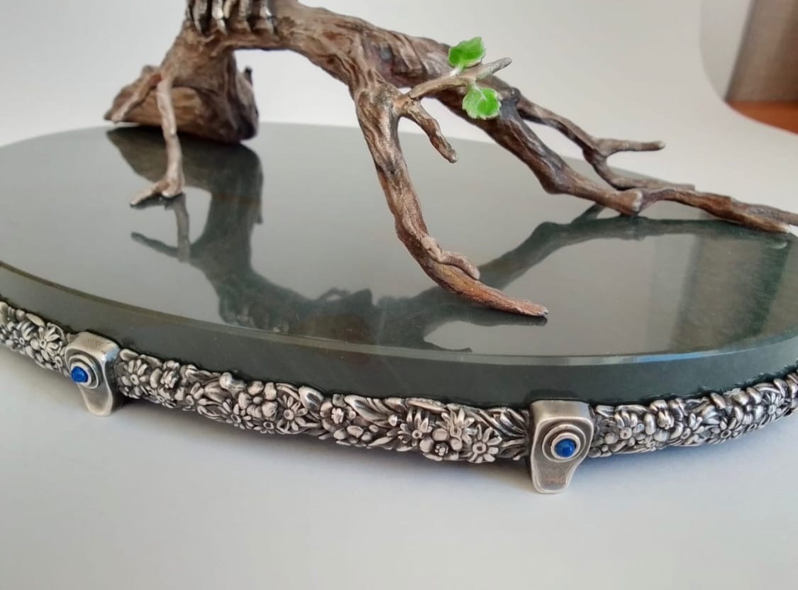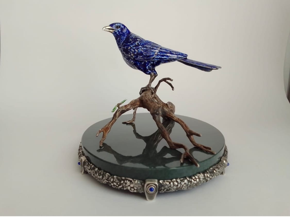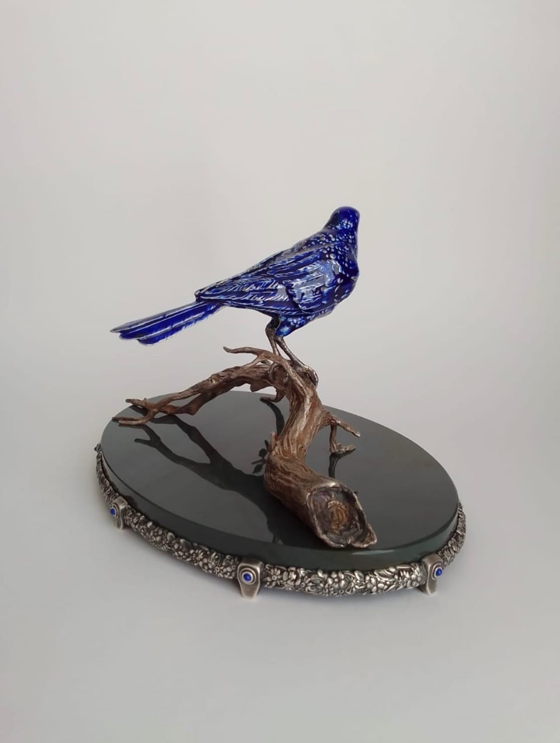 Синяя птица - символ счастья. Все надеются ее встретить. К кому она прилетает приходит удача. Миниатюра исполняет мечты и помогает в делах. Чудеса происходят с теми, кто в них верит. Вес изделия 1750 грамм Размер: 255 мм в длину, 180 мм в ширину, 150 мм в высоту. Изготовлено из афганского лазурита, калканской яшмы, серебра, латуни и горячей эмали. Подробное описание: Миниатюра посвящена теме вечного поиска человеком символа счастья и познания бытия – Синей птицы. Сказания повествуют, что «если человек найдет синюю птицу, то будет всё знать и всё видеть». Понятие Синяя птица давно стало нарицательным. Каждый творческий человек рано или поздно обращается к этой теме. Чтобы не случилось – мечтайте, идите к своей мечте, и птица счастья прилетит к вам. Мгновение радость и абсолютного счастья, которое подобно взмаху синих крыльев, то появляется в ваше жизни, то снова исчезает.