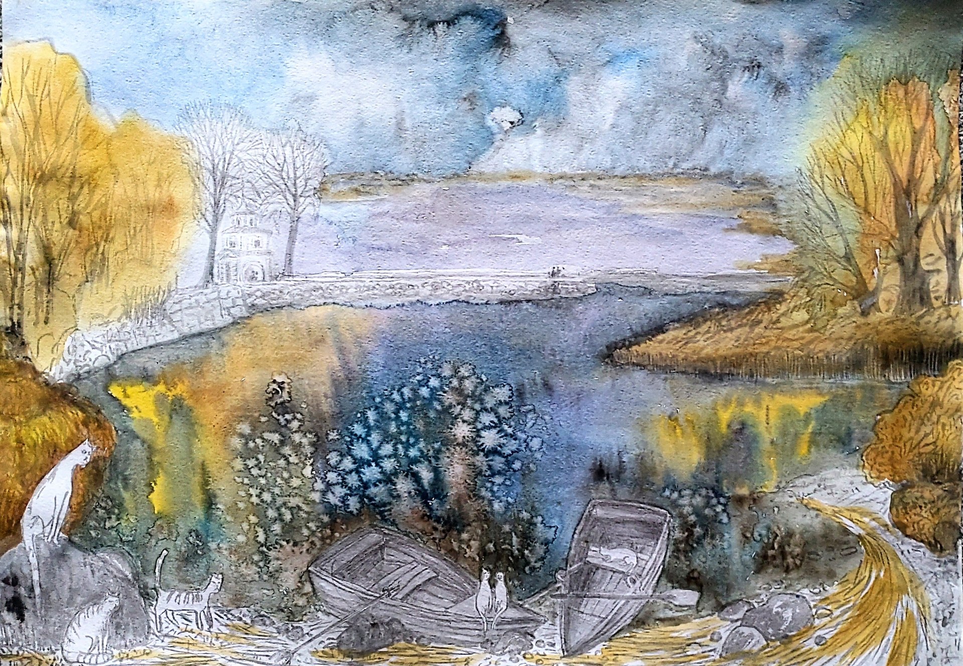 "Разошлись,как в море корабли Осень". Смешанная техника: акварель,тушь,чернила 40*60, 2021 5000р Не оформлена. Передам по вторникам метро Кропоткинская.Или другим способом по договоренности.